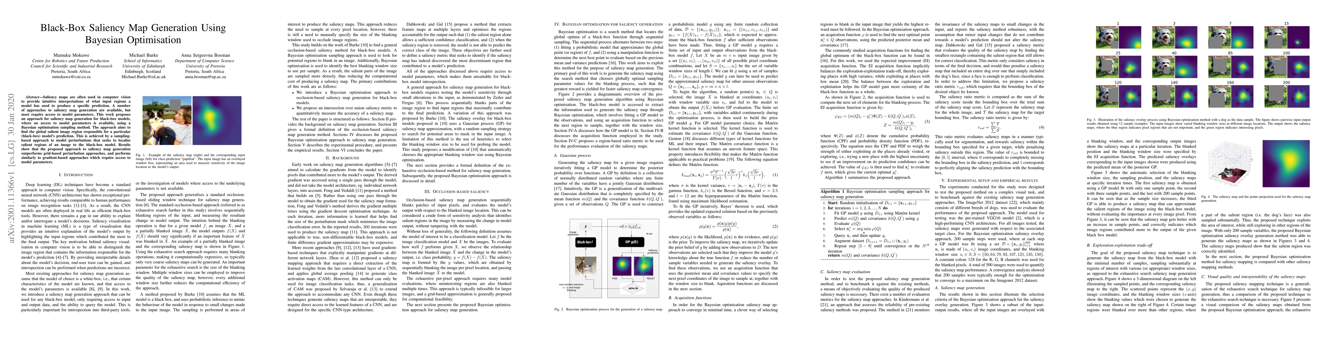 This paper proposes a Bayesian optimisation method for generating saliency maps for black-box models in computer vision, localising salient image regions without needing model parameters. The approach outperforms grid-based methods and is comparable to gradient-based methods that require model access.