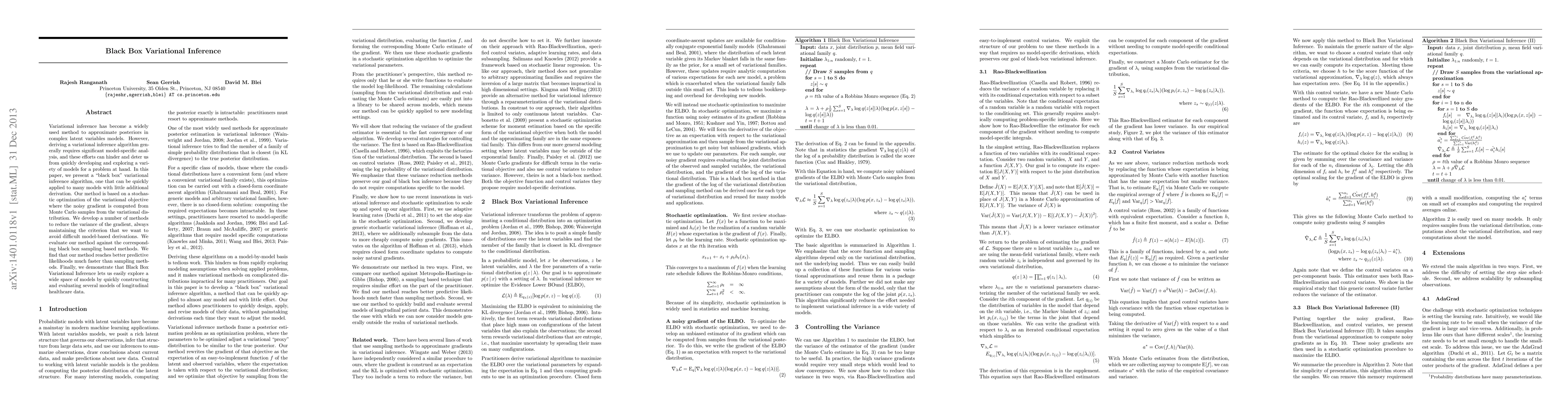 This paper introduces a "black box" variational inference algorithm that simplifies the application of variational inference across various models with minimal derivation. The method optimizes the variational objective using stochastic optimization and Monte Carlo samples, reducing gradient variance without complex model-specific analysis, and outperforms black box sampling methods in predictive likelihood and model exploration.