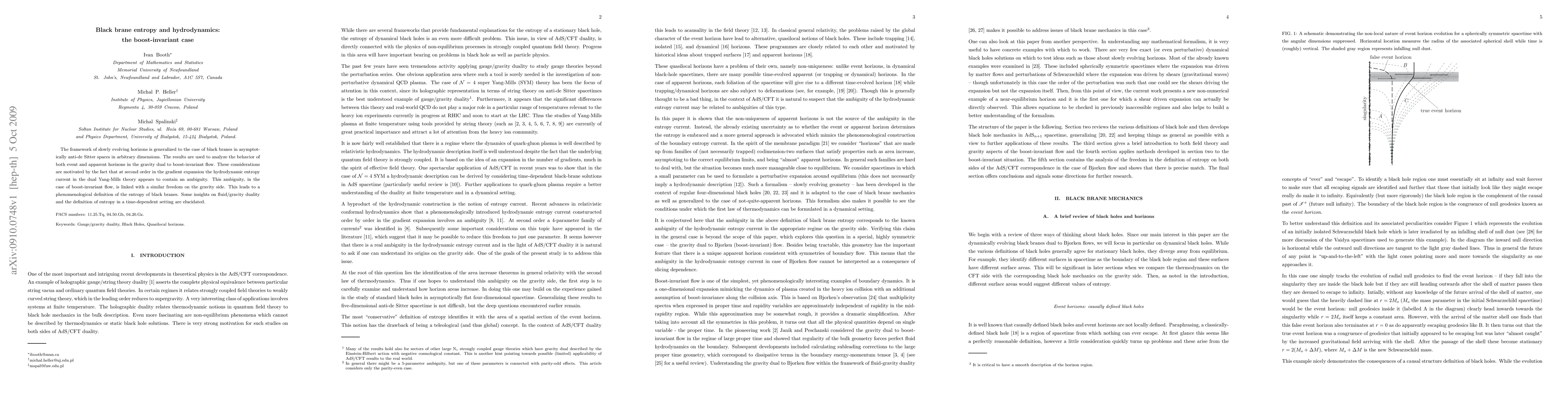 This paper studies the behavior of event and apparent horizons in black branes with asymptotically anti-de Sitter spaces, resolving an ambiguity in hydrodynamic entropy current for boost-invariant flow, and introducing a phenomenological definition of black brane entropy.