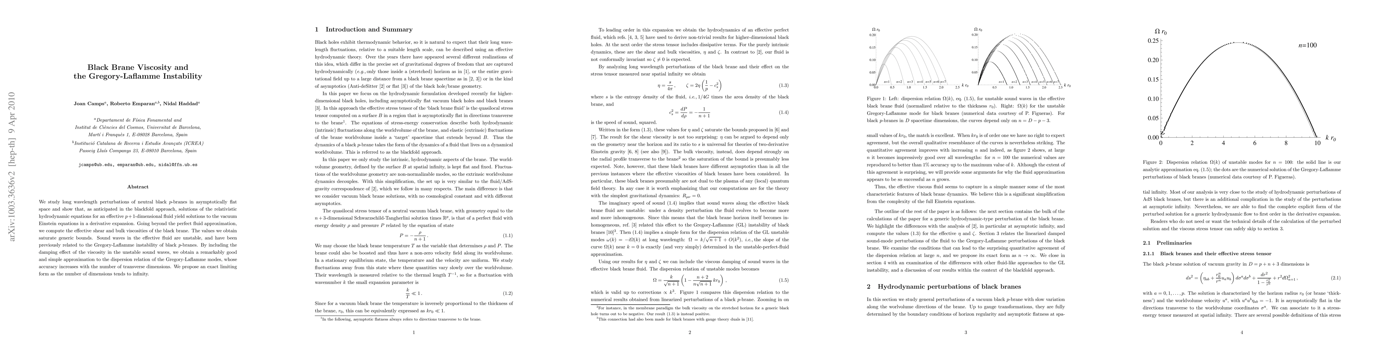 We study long wavelength perturbations of neutral black p-branes in asymptotically flat space and show that, as anticipated in the blackfold approach, solutions of the relativistic hydrodynamic equations for an effective p+1-dimensional fluid yield solutions to the vacuum Einstein equations in a derivative expansion. Going beyond the perfect fluid approximation, we compute the effective shear and bulk viscosities of the black brane. The values we obtain saturate generic bounds. Sound waves in the effective fluid are unstable, and have been previously related to the Gregory-Laflamme instability of black p-branes. By including the damping effect of the viscosity in the unstable sound waves, we obtain a remarkably good and simple approximation to the dispersion relation of the Gregory-Laflamme modes, whose accuracy increases with the number of transverse dimensions. We propose an exact limiting form as the number of dimensions tends to infinity.