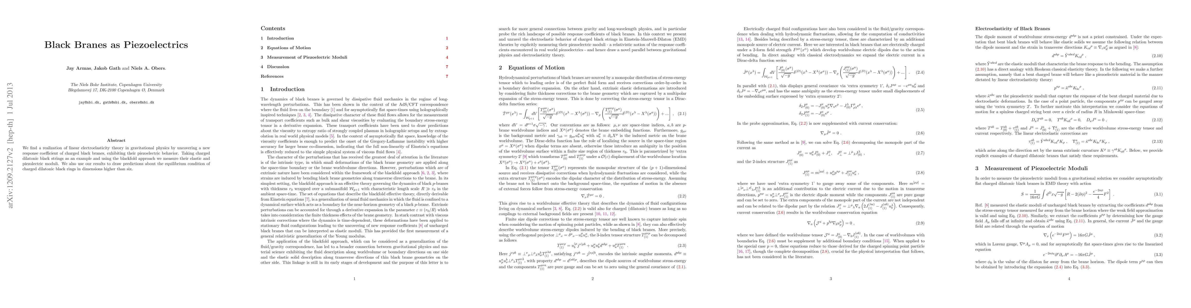 This paper reveals piezoelectric behavior in charged black branes, demonstrating a new response coefficient in gravitational physics. Using charged dilatonic black strings and the blackfold approach, the study measures their elastic and piezoelectric moduli, and predicts the equilibrium conditions for higher-dimensional charged dilatonic black rings.