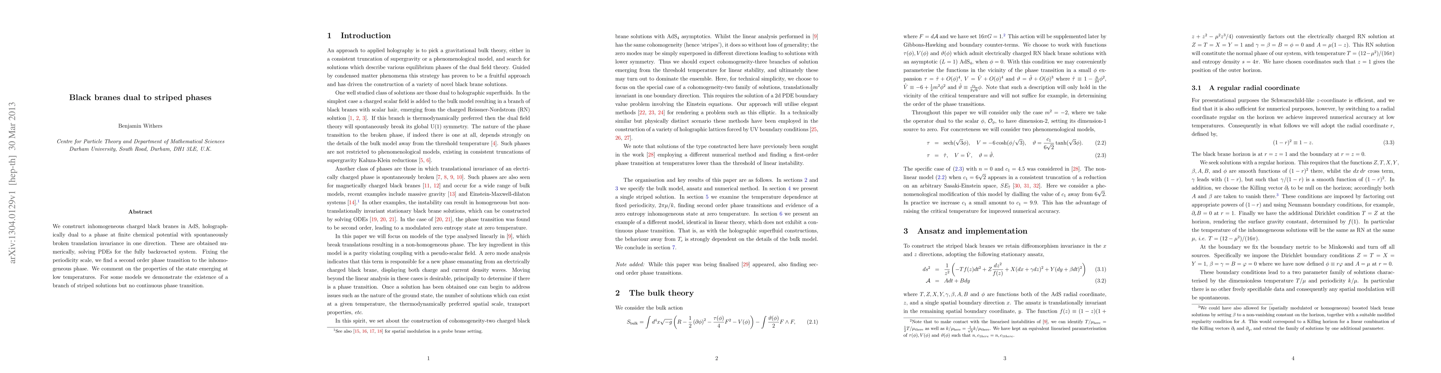 We construct inhomogeneous charged black branes in AdS, holographically dual to a phase at finite chemical potential with spontaneously broken translation invariance in one direction. These are obtained numerically, solving PDEs for the fully backreacted system. Fixing the periodicity scale, we find a second order phase transition to the inhomogeneous phase. We comment on the properties of the state emerging at low temperatures. For some models we demonstrate the existence of a branch of striped solutions but no continuous phase transition.