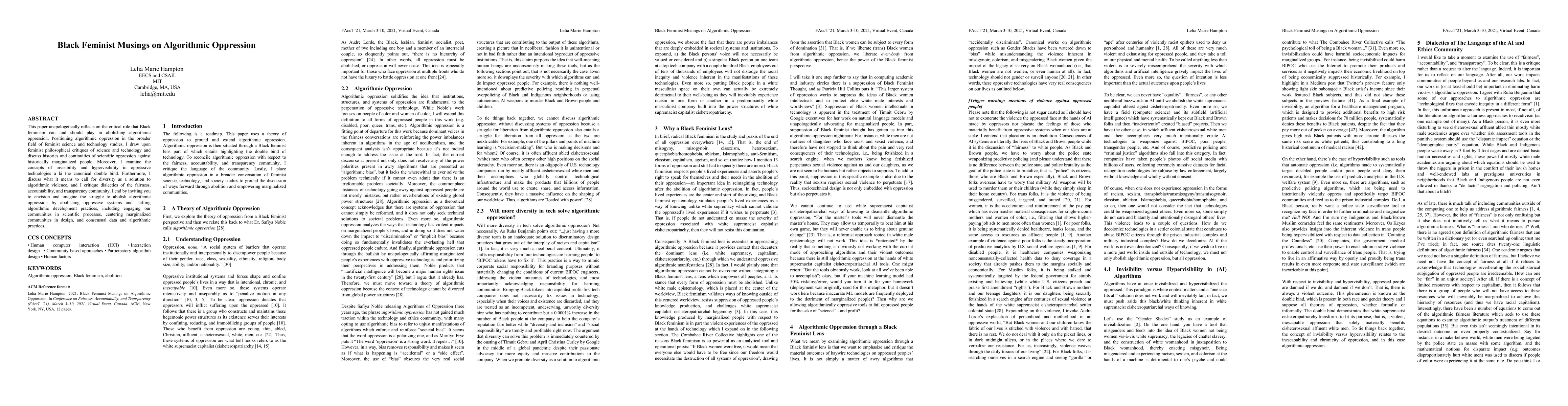 This paper explores how Black feminism can help abolish algorithmic oppression by examining the role of science, technology, and marginalized communities in shaping algorithms. It proposes a shift towards inclusive design practices to counter algorithmic violence and advocate for diversity as a solution.