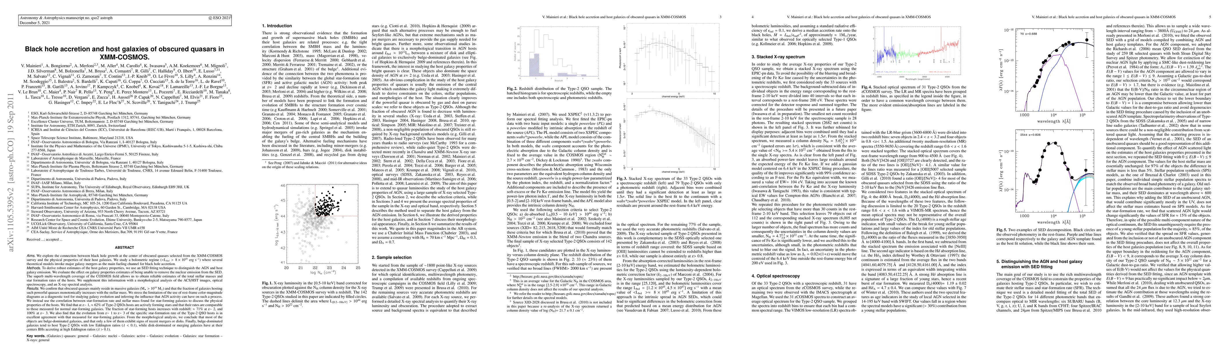 The research examines obscured quasars from the XMM-COSMOS survey, finding they reside in massive galaxies and their star-forming activity is common, with rates comparable to normal star-forming galaxies. The study emphasizes the limitations of color-magnitude diagrams and uses star-formation rate vs. stellar mass correlation instead. It concludes that bulge-dominated galaxies host low-Eddington ratio quasars, while disk-dominated or merging galaxies host high-Eddington ratio quasars.