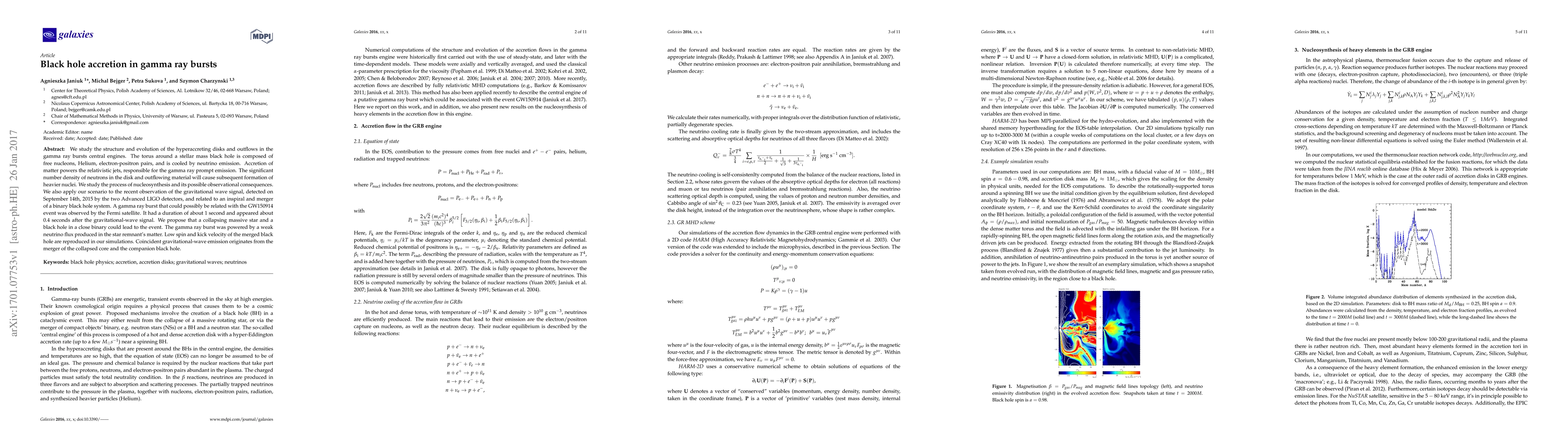 We study the structure and evolution of the hyperaccreting disks and outflows in the gamma ray bursts central engines. The torus around a stellar mass black hole is composed of free nucleons, Helium, electron-positron pairs, and is cooled by neutrino emission. Accretion of matter powers the relativistic jets, responsible for the gamma ray prompt emission. The significant number density of neutrons in the disk and outflowing material will cause subsequent formation of heavier nuclei. We study the process of nucleosynthesis and its possible observational consequences. We also apply our scenario to the recent observation of the gravitational wave signal, detected on September 14th, 2015 by the two Advanced LIGO detectors, and related to an inspiral and merger of a binary black hole system. A gamma ray burst that could possibly be related with the GW150914 event was observed by the Fermi satellite. It had a duration of about 1 second and appeared about 0.4 seconds after the gravitational-wave signal. We propose that a collapsing massive star and a black hole in a close binary could lead to the event. The gamma ray burst was powered by a weak neutrino flux produced in the star remnant's matter. Low spin and kick velocity of the merged black hole are reproduced in our simulations. Coincident gravitational-wave emission originates from the merger of the collapsed core and the companion black hole.
