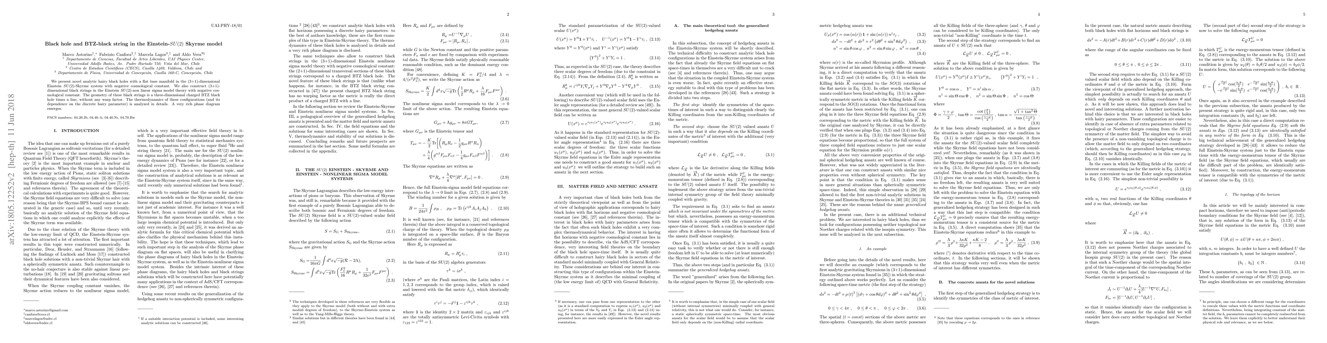 We present novel analytic hairy black holes with a flat base manifold in the (3+1)-dimensional Einstein SU(2)-Skyrme system with negative cosmological constant. We also construct (3+1)-dimensional black strings in the Einstein $SU(2)$-non linear sigma model theory with negative cosmological constant. The geometry of these black strings is a three-dimensional charged BTZ black hole times a line, without any warp factor. The thermodynamics of these configurations (and its dependence on the discrete hairy parameter) is analyzed in details. A very rich phase diagram emerges.