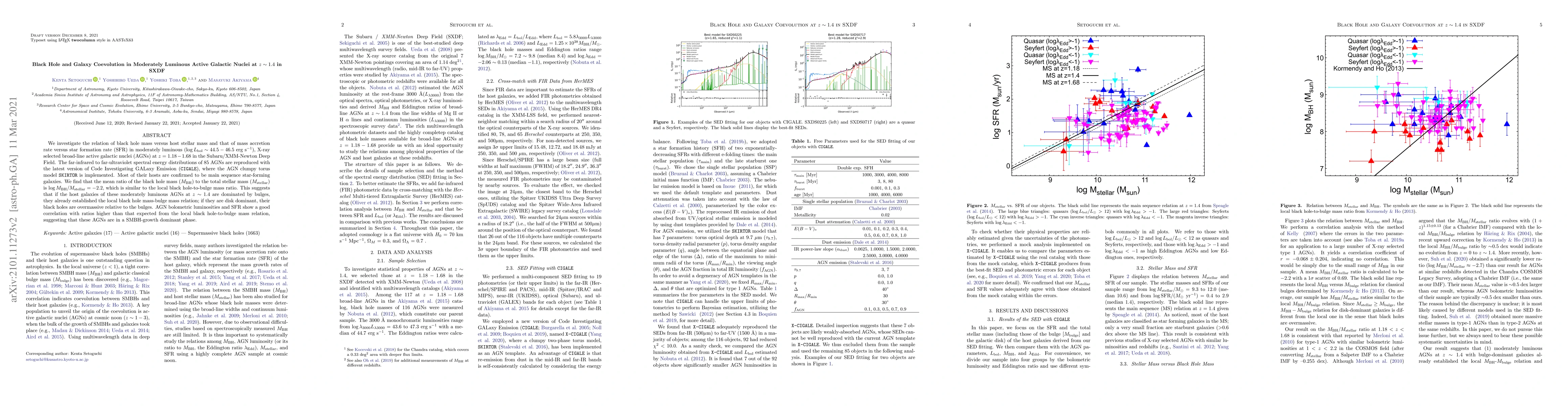 This study examines the coevolution of black holes and galaxies in moderately luminous active galactic nuclei at redshifts around 1.4, finding a black hole-to-stellar mass ratio similar to the local universe, indicating established black hole-bulge mass relations. It also reveals a strong correlation between AGN luminosity and star formation rate, suggesting these AGNs are primarily growing through black hole accretion.