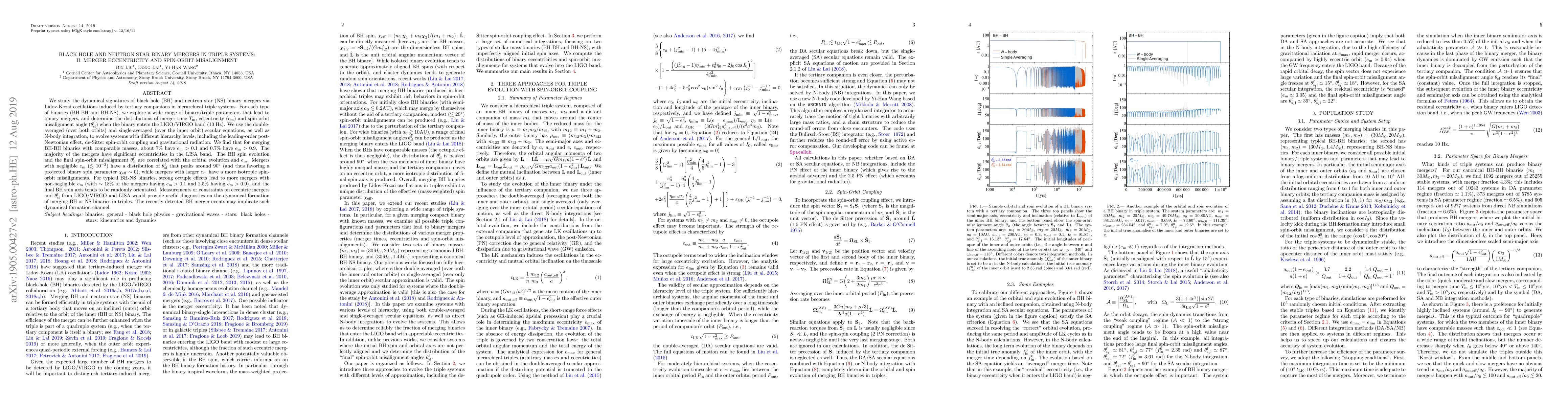 This paper investigates the eccentricity and spin-orbit misalignment in black hole (BH) and neutron star (NS) binary mergers within hierarchical triple systems, finding that BH-BH mergers exhibit significant eccentricities, while BH-NS mergers show more isotropic spin-orbit misalignments due to strong octuple effects.