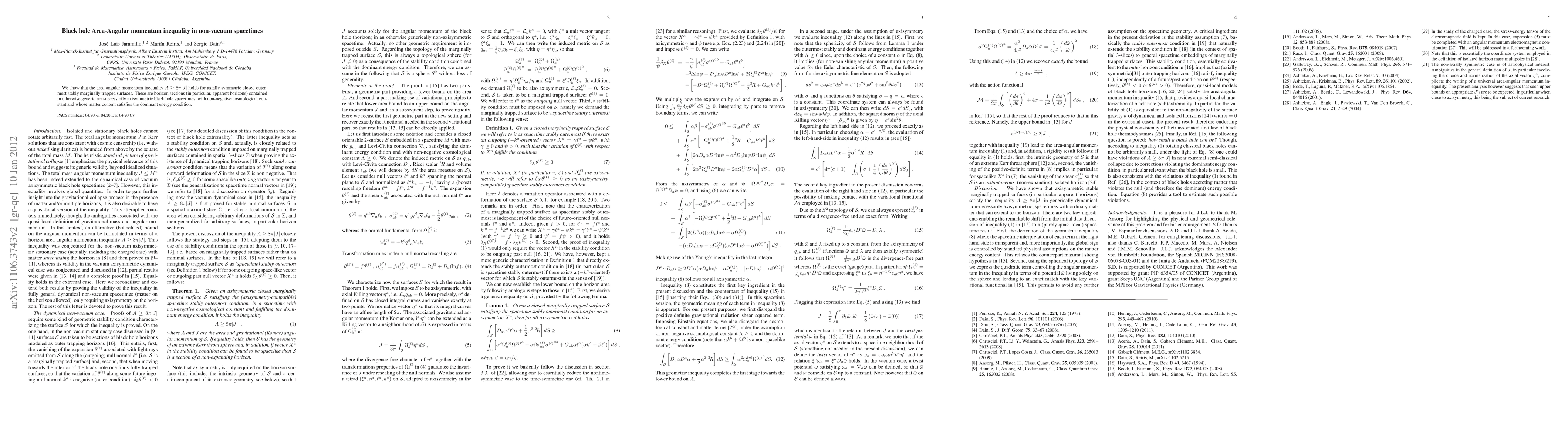The paper establishes that the area-angular momentum inequality \( A \geq 8\pi|J| \) applies to axially symmetric closed outermost stably marginally trapped surfaces in non-vacuum spacetimes, including black holes with non-negative cosmological constants and matter satisfying the dominant energy condition. This extends the inequality to more general black hole scenarios beyond vacuum solutions.