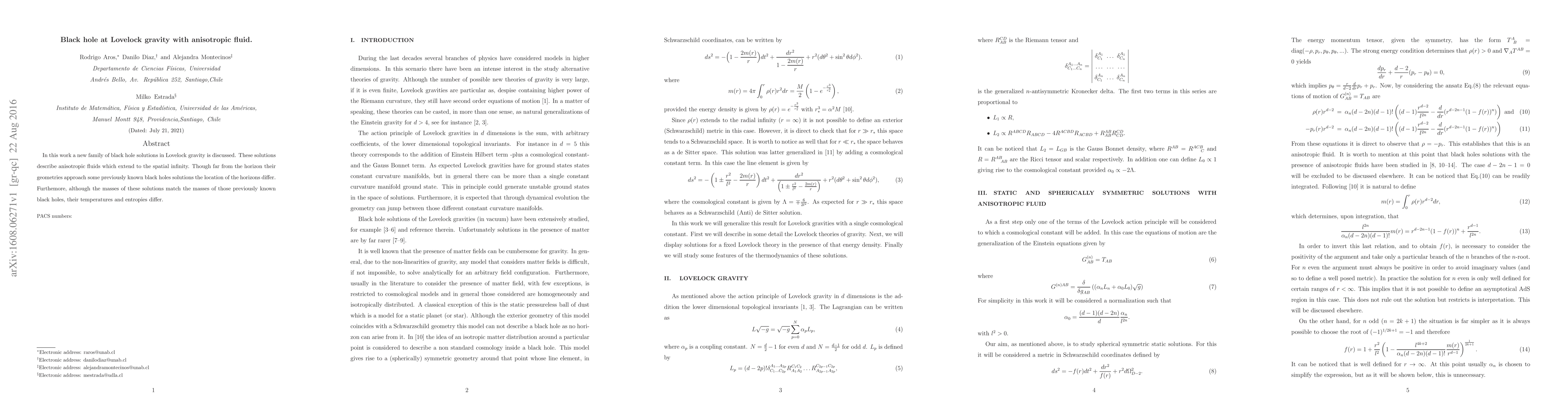In this work a new family of black hole solutions in Lovelock gravity is discussed. These solutions describe anisotropic fluids which extend to the spatial infinity. Though far from the horizon their geometries approach some previously known black holes solutions the location of the horizons differ. Furthemore, although the masses of these solutions match the masses of those previously known black holes, their temperatures and entropies differ.