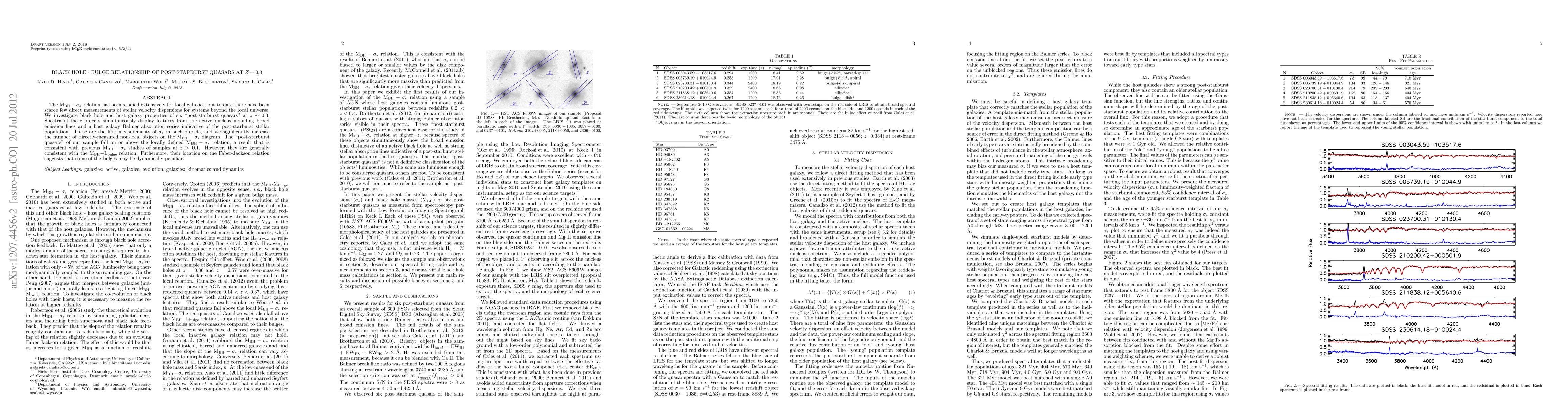 This study investigates the black hole and host galaxy properties of six "post-starburst quasars" at z ≈ 0.3, providing the first direct measurements of stellar velocity dispersions in such objects. The findings suggest these quasars align with the locally defined MBH-σ relation and generally fit the MBH-Lbulge relation, though some may exhibit dynamically peculiar bulges.