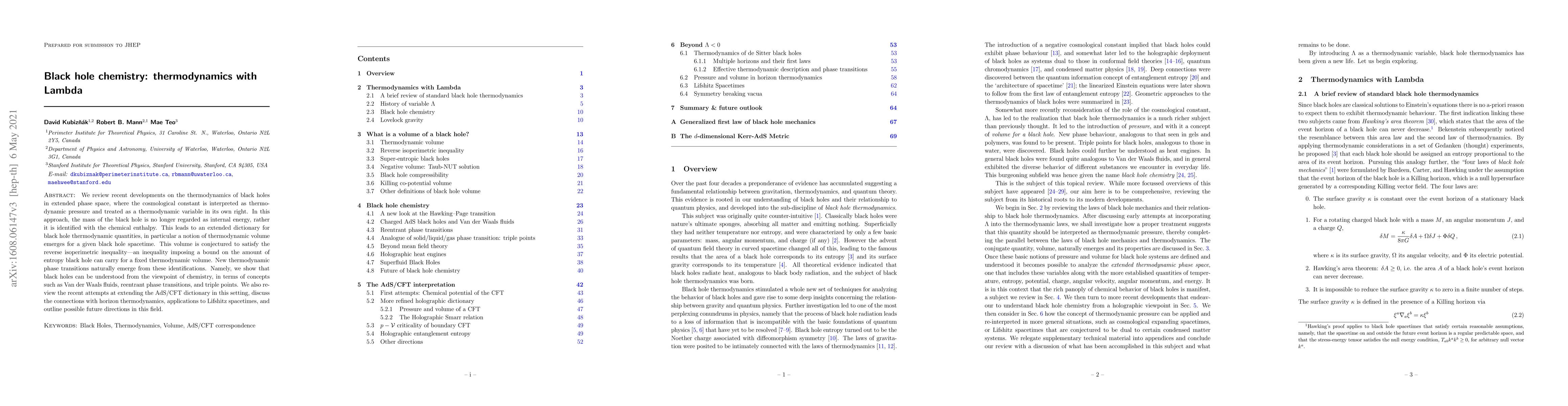 We review recent developments on the thermodynamics of black holes in extended phase space, where the cosmological constant is interpreted as thermodynamic pressure and treated as a thermodynamic variable in its own right. In this approach, the mass of the black hole is no longer regarded as internal energy, rather it is identified with the chemical enthalpy. This leads to an extended dictionary for black hole thermodynamic quantities, in particular a notion of thermodynamic volume emerges for a given black hole spacetime. This volume is conjectured to satisfy the reverse isoperimetric inequality - an inequality imposing a bound on the amount of entropy black hole can carry for a fixed thermodynamic volume. New thermodynamic phase transitions naturally emerge from these identifications. Namely, we show that black holes can be understood from the viewpoint of chemistry, in terms of concepts such as Van der Waals fluids, reentrant phase transitions, and triple points. We also review the recent attempts at extending the AdS/CFT dictionary in this setting, discuss the connections with horizon thermodynamics, applications to Lifshitz spacetimes, and outline possible future directions in this field.