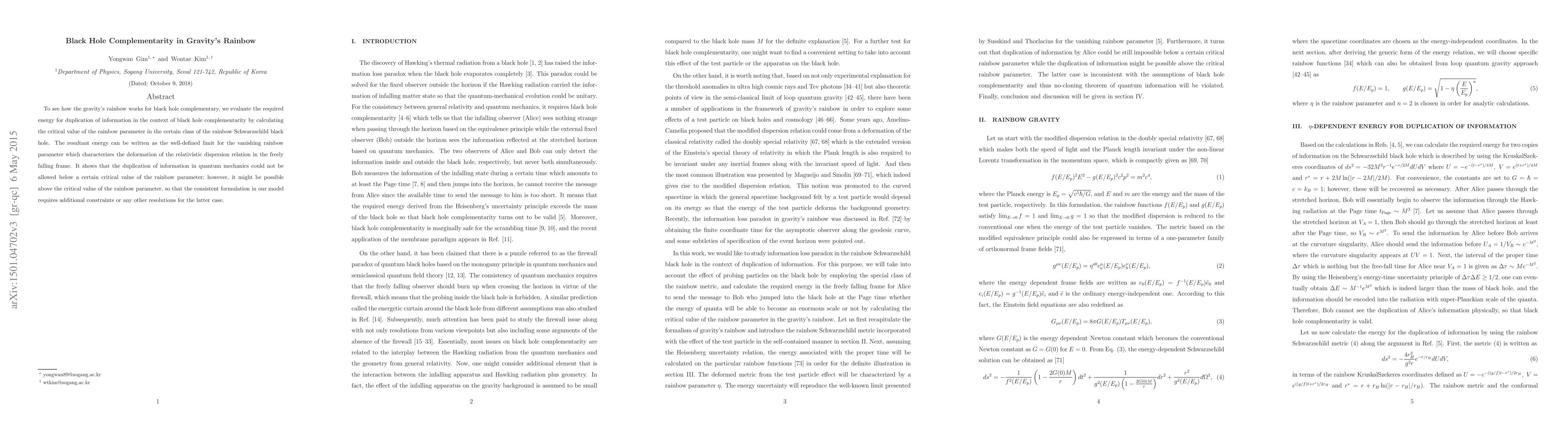 This paper investigates how "gravity's rainbow," a modified relativistic dispersion relation, impacts black hole complementarity. It finds that information duplication in quantum mechanics is prohibited below a critical rainbow parameter value but might be allowed above it, necessitating additional constraints or resolutions for consistency.