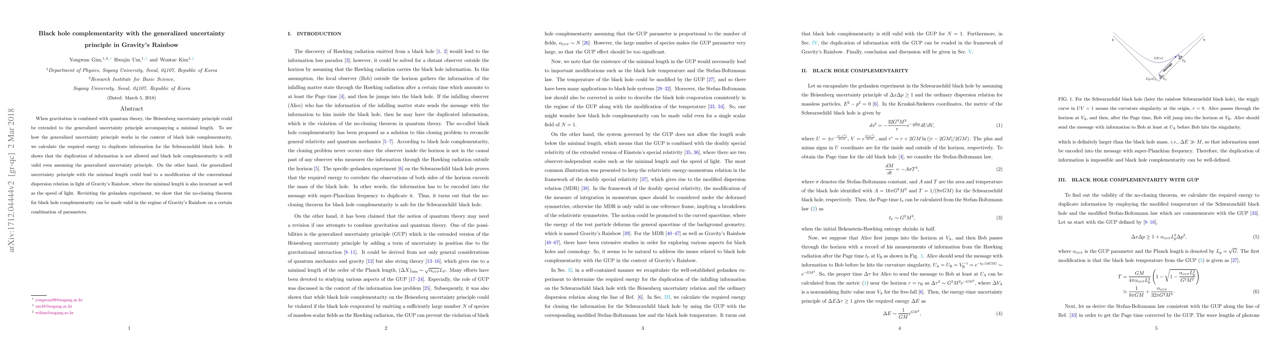 This paper explores black hole complementarity under the generalized uncertainty principle, demonstrating that information duplication is disallowed and thus complementarity remains valid. It also examines how the generalized uncertainty principle might modify the dispersion relation in Gravity's Rainbow, affirming the no-cloning theorem within this theoretical framework.