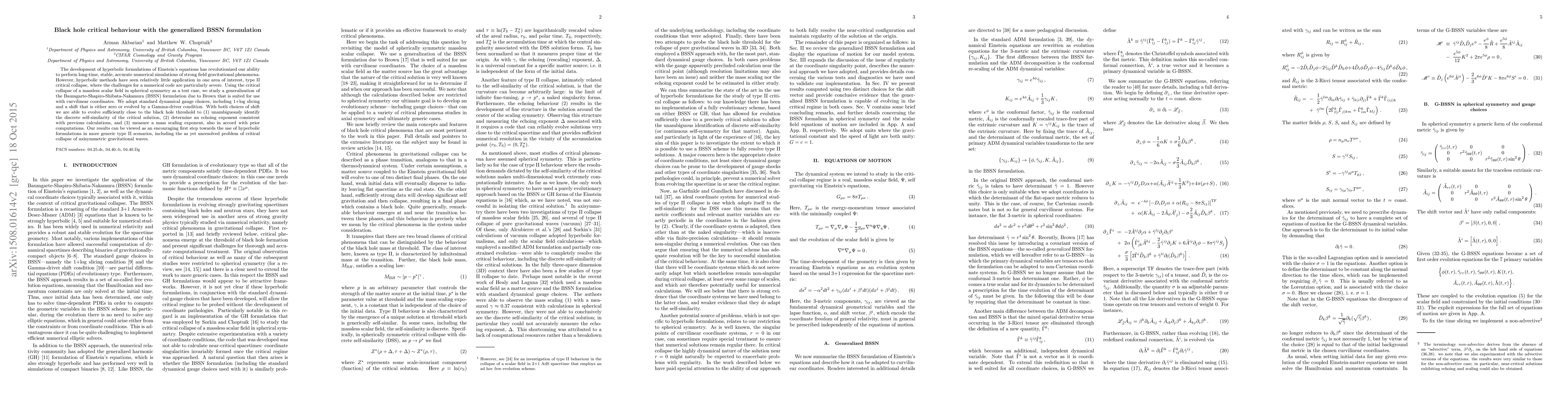 The development of hyperbolic formulations of Einstein's equations has revolutionized our ability to perform long-time, stable, accurate numerical simulations of strong field gravitational phenomena. However, hyperbolic methods have seen relatively little application in one area of interest, type II critical collapse, where the challenges for a numerical code are particularly severe. Using the critical collapse of a massless scalar field in spherical symmetry as a test case, we study a generalization of the Baumgarte-Shapiro-Shibata-Nakamura (BSSN) formulation due to Brown that is suited for use with curvilinear coordinates. We adopt standard dynamical gauge choices, including 1+log slicing and a shift that is either zero or evolved by a Gamma-driver condition. With both choices of shift we are able to evolve sufficiently close to the black hole threshold to (1) unambiguously identify the discrete self-similarity of the critical solution (2) determine an echoing exponent consistent with previous calculations and (3) measure a mass scaling exponent, also in accord with prior computations. Our results can be viewed as an encouraging first step towards the use of hyperbolic formulations in more generic type II scenarios, including the as yet unresolved problem of critical collapse of axisymmetric gravitational waves.