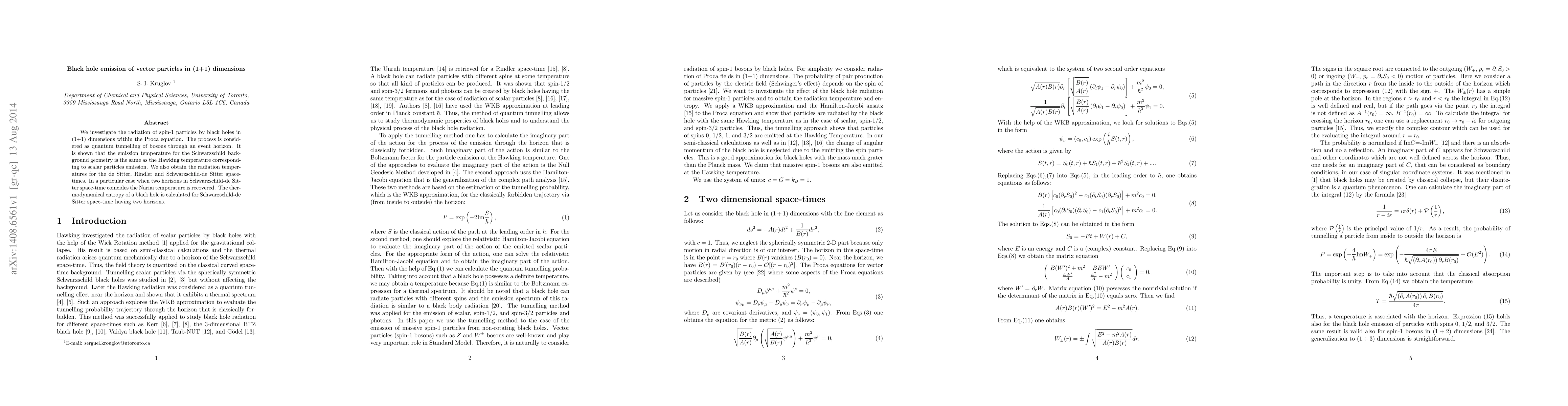 This paper explores the emission of spin-1 vector particles by black holes in (1+1) dimensions using the Proca equation, treating it as quantum tunneling. It finds that the emission temperature for Schwarzschild geometry matches the Hawking temperature for scalar particles, and calculates radiation temperatures for de Sitter, Rindler, and Schwarzschild-de Sitter space-times, recovering the Nariai temperature in specific conditions.