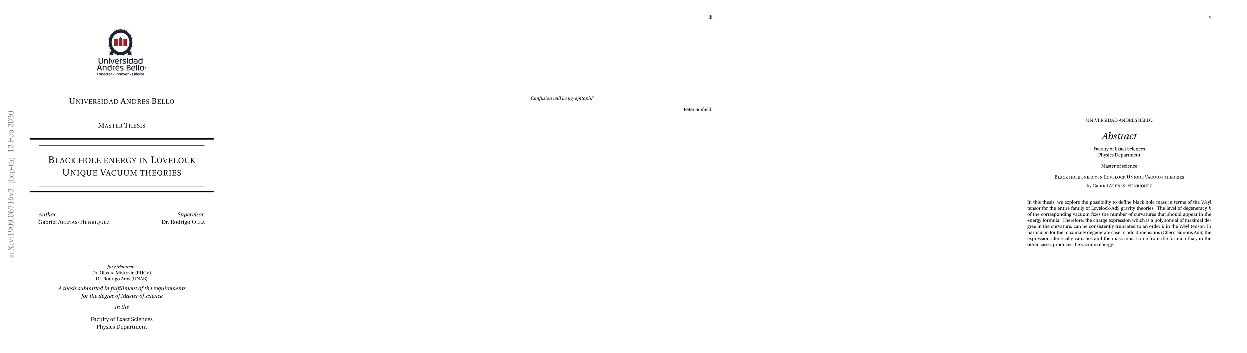 In this thesis, we explore the possibility to define black hole mass in terms of the Weyl tensor for the entire family of Lovelock-AdS gravity theories. The level of degeneracy $k$ of the corresponding vacuum fixes the number of curvatures that should appear in the energy formula. Therefore, the charge expression which is a polynomial of maximal degree in the curvature, can be consistently truncated to an order $k$ in the Weyl tensor. In particular, for the maximally degenerate case in odd dimensions (Chern-Simons AdS) the expression identically vanishes and the mass must come from the formula that, in the other cases, produces the vacuum energy.