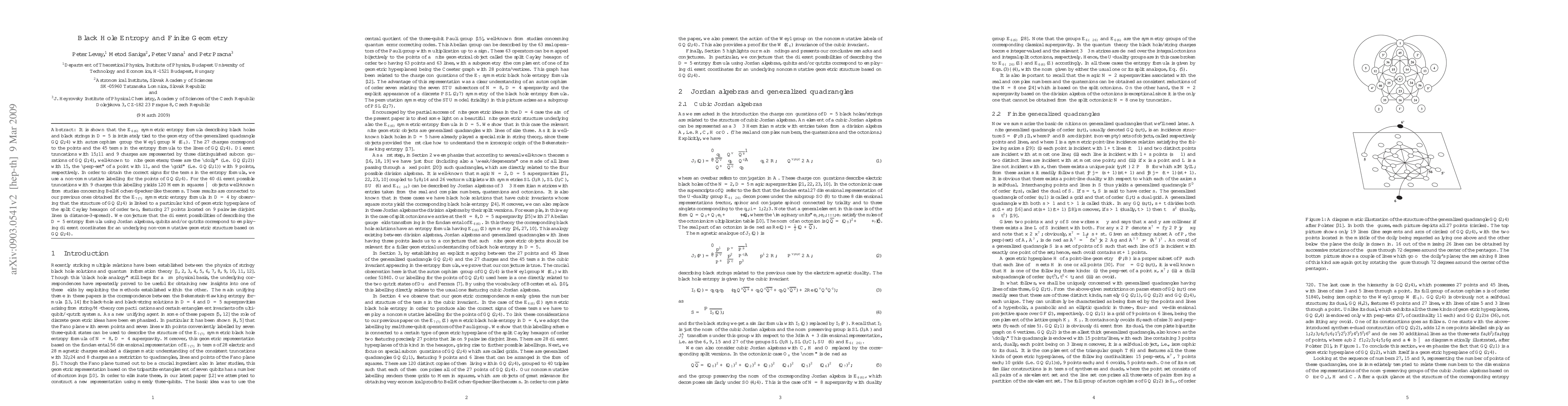 It is shown that the $E_{6(6)}$ symmetric entropy formula describing black holes and black strings in D=5 is intimately tied to the geometry of the generalized quadrangle GQ$(2,4)$ with automorphism group the Weyl group $W(E_6)$. The 27 charges correspond to the points and the 45 terms in the entropy formula to the lines of GQ$(2,4)$. Different truncations with $15, 11$ and 9 charges are represented by three distinguished subconfigurations of GQ$(2,4)$, well-known to finite geometers; these are the "doily" (i. e. GQ$(2,2)$) with 15, the "perp-set" of a point with 11, and the "grid" (i. e. GQ$(2,1)$) with 9 points, respectively. In order to obtain the correct signs for the terms in the entropy formula, we use a non- commutative labelling for the points of GQ$(2,4)$. For the 40 different possible truncations with 9 charges this labelling yields 120 Mermin squares -- objects well-known from studies concerning Bell-Kochen-Specker-like theorems. These results are connected to our previous ones obtained for the $E_{7(7)}$ symmetric entropy formula in D=4 by observing that the structure of GQ$(2,4)$ is linked to a particular kind of geometric hyperplane of the split Cayley hexagon of order two, featuring 27 points located on 9 pairwise disjoint lines (a distance-3-spread). We conjecture that the different possibilities of describing the D=5 entropy formula using Jordan algebras, qubits and/or qutrits correspond to employing different coordinates for an underlying non-commutative geometric structure based on GQ$(2,4)$.