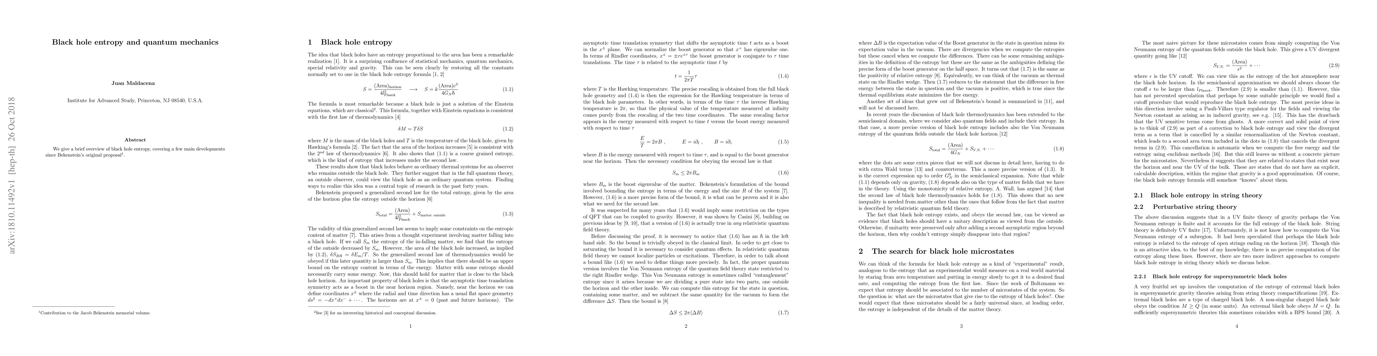 This paper provides an overview of black hole entropy, a fundamental concept in physics that relates to the information contained within black holes, and its connections to quantum mechanics.