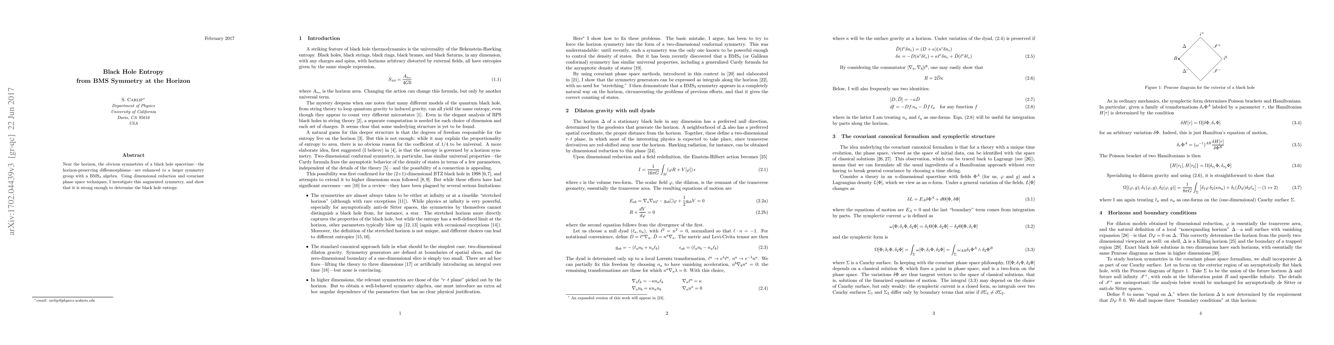 The paper explores how the BMS (Bondi-Metzner-Sachs) symmetry group near a black hole's horizon can determine the black hole's entropy through dimensional reduction and covariant phase space methods. The enhanced horizon-preserving symmetries are shown to be sufficient for this calculation.