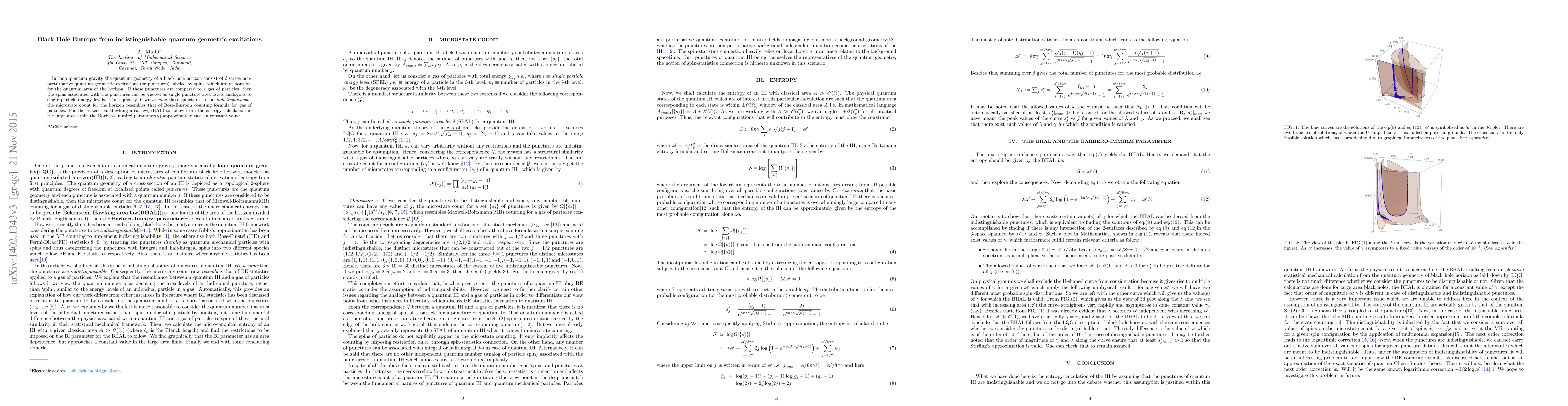 This research paper proposes that black hole entropy can be calculated using indistinguishable quantum geometric excitations, which leads to a Bose-Einstein counting formula for gas of particles. The Barbero-Immirzi parameter approximately takes a constant value for the Bekenstein-Hawking area law to follow.