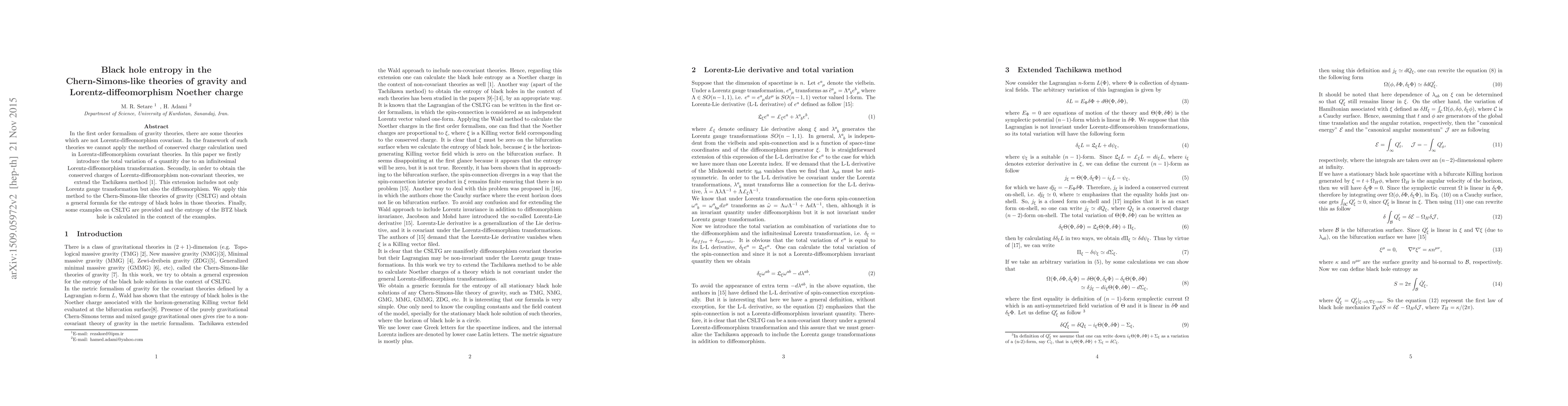 In the first order formalism of gravity theories, there are some theories which are not Lorentz-diffeomorphism covariant. In the framework of such theories we cannot apply the method of conserved charge calculation used in Lorentz-diffeomorphism covariant theories. In this paper we firstly introduce the total variation of a quantity due to an infinitesimal Lorentz-diffeomorphism transformation. Secondly, in order to obtain the conserved charges of Lorentz-diffeomorphism non-covariant theories, we extend the Tachikawa method \cite{3}. This extension includes not only Lorentz gauge transformation but also the diffeomorphism. We apply this method to the Chern-Simons-like theories of gravity (CSLTG) and obtain a general formula for the entropy of black holes in those theories. Finally, some examples on CSLTG are provided and the entropy of the BTZ black hole is calculated in the context of the examples.