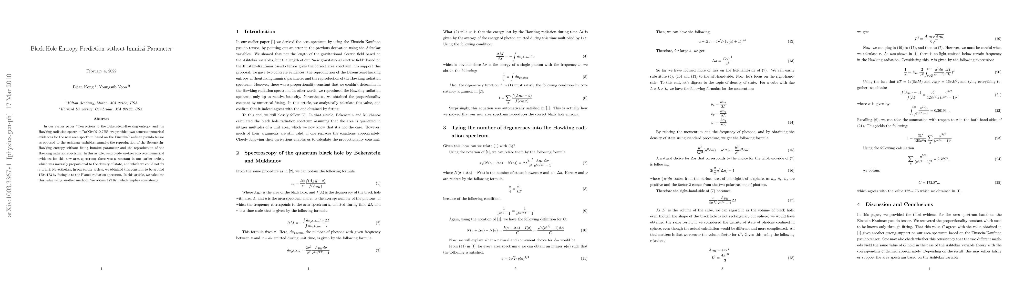 In our earlier paper "Corrections to the Bekenstein-Hawking entropy and the Hawking radiation spectrum", arXiv:0910.2755, we provided two concrete numerical evidences for the new area spectrum based on the Einstein-Kaufman pseudo tensor as opposed to the Ashtekar variables: namely, the reproduction of the Bekenstein-Hawking entropy without fixing Immirzi parameter and the reproduction of the Hawking radiation spectrum. In this article, we provide another concrete, numerical evidence for this new area spectrum; there was a constant in our earlier article, which was inversely proportional to the density of state, and which we could not fix a priori. Nevertheless, in our earlier article, we obtained this constant to be around 172~173 by fitting it to the Planck radiation spectrum. In this article, we calculate this value using another method. We obtain 172.87...which implies consistency.