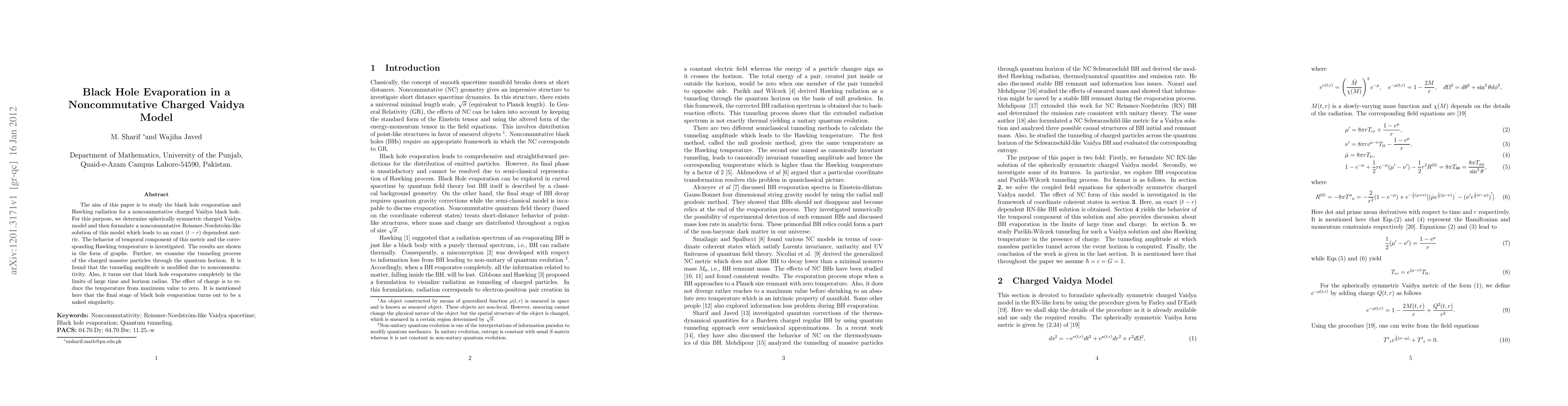 This paper investigates black hole evaporation and Hawking radiation in a noncommutative charged Vaidya model, deriving a noncommutative Reissner-Nordström-like solution and examining the modified tunneling process and complete evaporation, ultimately revealing a naked singularity at the end.