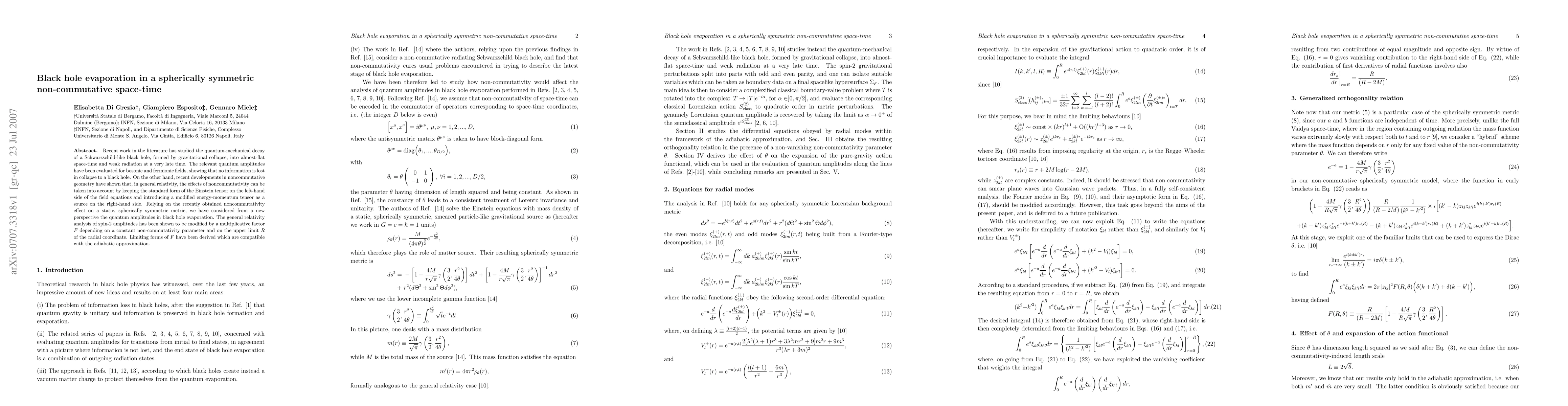 Recent work in the literature has studied the quantum-mechanical decay of a Schwarzschild-like black hole, formed by gravitational collapse, into almost-flat space-time and weak radiation at a very late time. The relevant quantum amplitudes have been evaluated for bosonic and fermionic fields, showing that no information is lost in collapse to a black hole. On the other hand, recent developments in noncommutative geometry have shown that, in general relativity, the effects of non-commutativity can be taken into account by keeping the standard form of the Einstein tensor on the left-hand side of the field equations and introducing a modified energy-momentum tensor as a source on the right-hand side. Relying on the recently obtained non-commutativity effect on a static, spherically symmetric metric, we have considered from a new perspective the quantum amplitudes in black hole evaporation. The general relativity analysis of spin-2 amplitudes has been shown to be modified by a multiplicative factor F depending on a constant non-commutativity parameter and on the upper limit R of the radial coordinate. Limiting forms of F have been derived which are compatible with the adiabatic approximation.