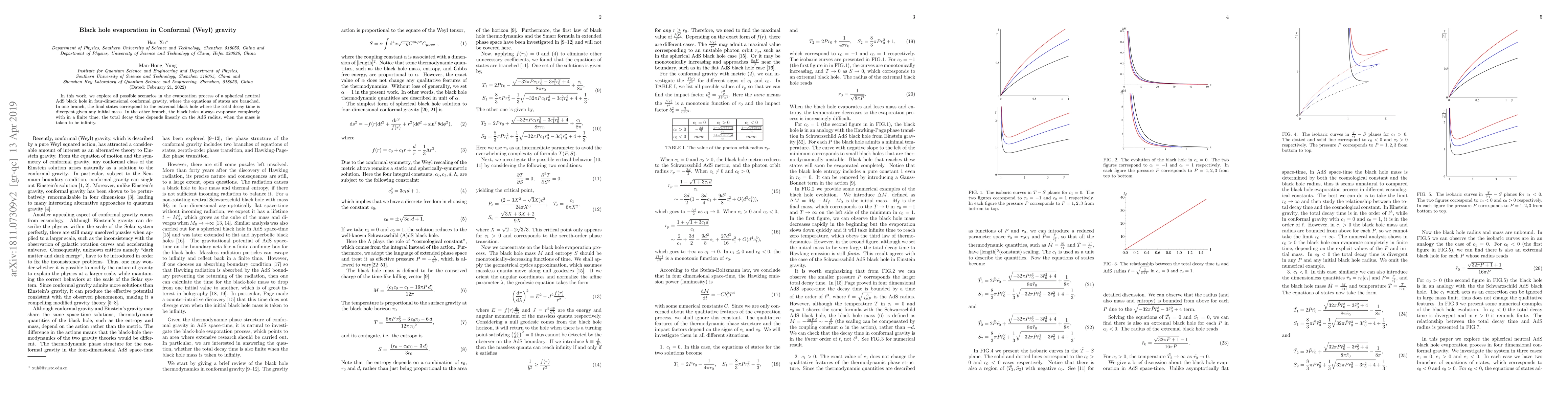 In this work, we explore all possible scenarios in the evaporation process of a spherical neutral AdS black hole in four-dimensional conformal gravity, where the equations of states are branched. In one branch, the final states correspond to the extremal black hole where the total decay time is divergent given any initial mass. In the other branch, the black holes always evaporate completely with in a finite time; the total decay time depends linearly on the AdS radius, when the mass is taken to be infinity.