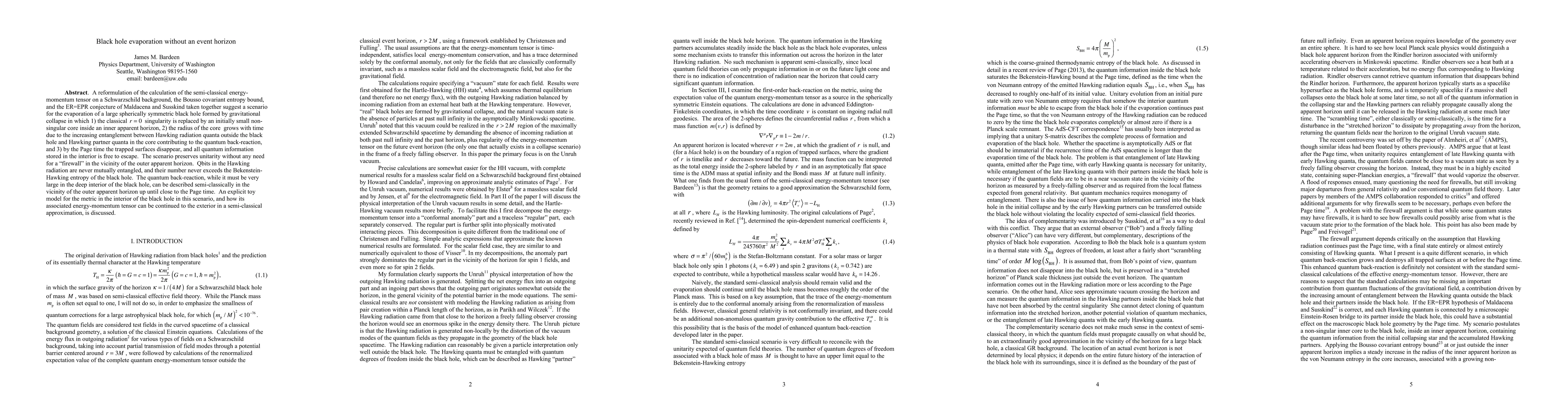 A reformulation of the calculation of the semi-classical energy-momentum tensor on a Schwarzschild background, the Bousso covariant entropy bound, and the ER=EPR conjecture of Maldacena and Susskind taken together suggest a scenario for the evaporation of a large spherically symmetric black hole formed in gravitational collapse in which 1) the classical r = 0 singularity is replaced by an initially small non-singular core inside an inner apparent horizon, 2) the radius of the core grows with time due to the increasing entanglement between Hawking radiation quanta outside the black hole and the Hawking partner quanta in the core contributing to the quantum back-reaction, and 3) by the Page time the trapped surfaces disappear and all quantum information stored in the interior is free to escape. The scenario preserves unitarity without any need for a "firewall" in the vicinity of the outer apparent horizon. Qbits in the Hawking radiation are never mutually entangled, and their number never exceeds the Bekenstein-Hawking entropy of the black hole. The quantum back-reaction, while it must be very large in the deep interior of the black hole, can be described semi-classically in the vicinity of the outer apparent horizon up until close to the Page time. An explicit toy model for the metric in the interior of the black hole, and how its associated energy-momentum tensor can be continued to the exterior in a semi-classical approximation, is discussed.