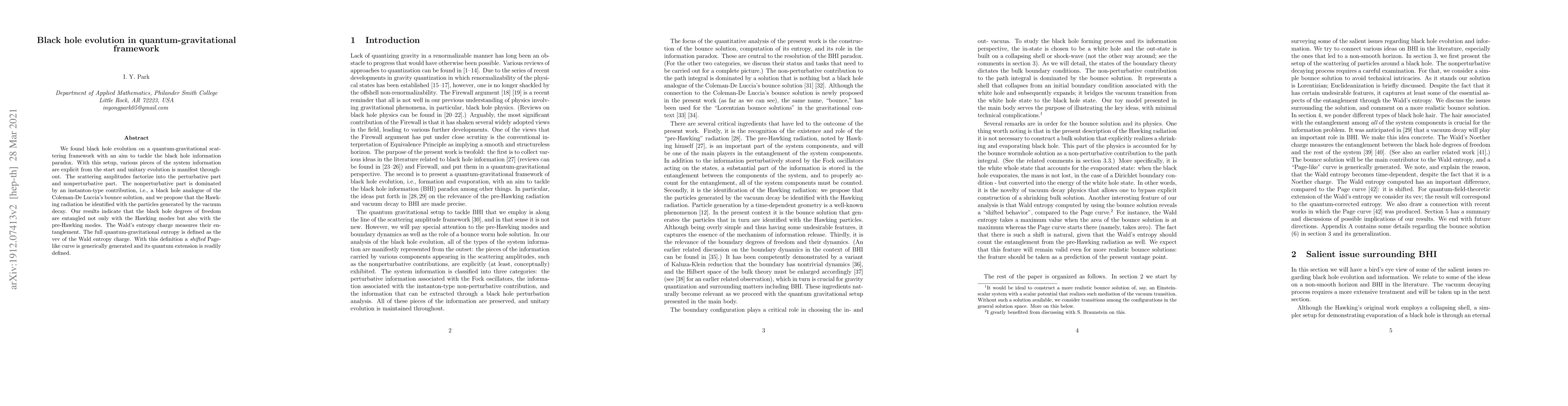 We found black hole evolution on a quantum-gravitational scattering framework with an aim to tackle the black hole information paradox. With this setup, various pieces of the system information are explicit from the start and unitary evolution is manifest throughout. The scattering amplitudes factorize into the perturbative part and nonperturbative part. The nonperturbative part is dominated by an instanton-type contribution, i.e., a black hole analogue of the Coleman-De Luccia's bounce solution, and we propose that the Hawking radiation be identified with the particles generated by the vacuum decay. Our results indicate that the black hole degrees of freedom are entangled not only with the Hawking modes but also with the pre-Hawking modes. The Wald's entropy charge measures their entanglement. The full quantum-gravitational entropy is defined as the vev of the Wald entropy charge. With this definition a {\em shifted} Page-like curve is generically generated and its quantum extension is readily defined.