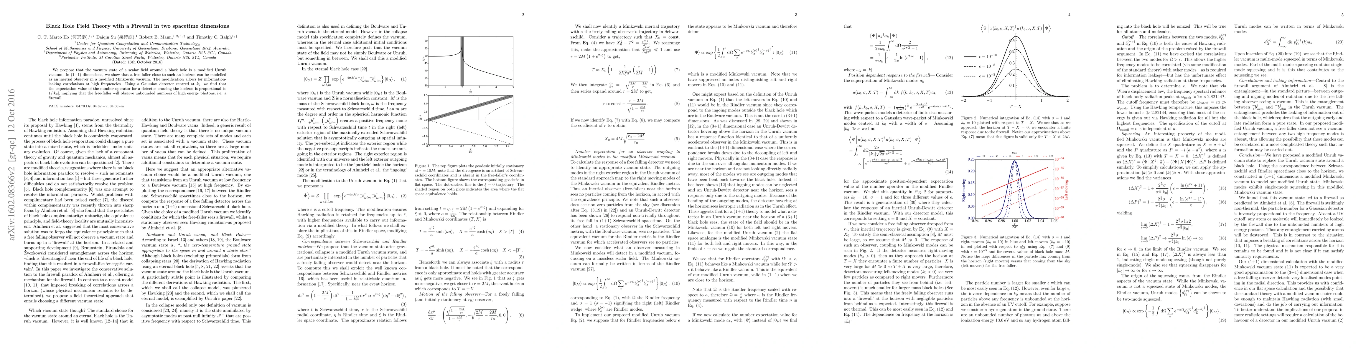 We propose that the vacuum state of a scalar field around a black hole is a modified Unruh vacuum. In (1+1) dimensions, we show that a free-faller close to such an horizon can be modelled as an inertial observer in a modified Minkowski vacuum. The modification allows for information-leaking correlations at high frequencies. Using a Gaussian detector centred at $k_0$, we find that the expectation value of the number operator for a detector crossing the horizon is proportional to $1/|k_0|$, implying that the free-faller will observe unbounded numbers of high energy photons, i.e. a firewall.