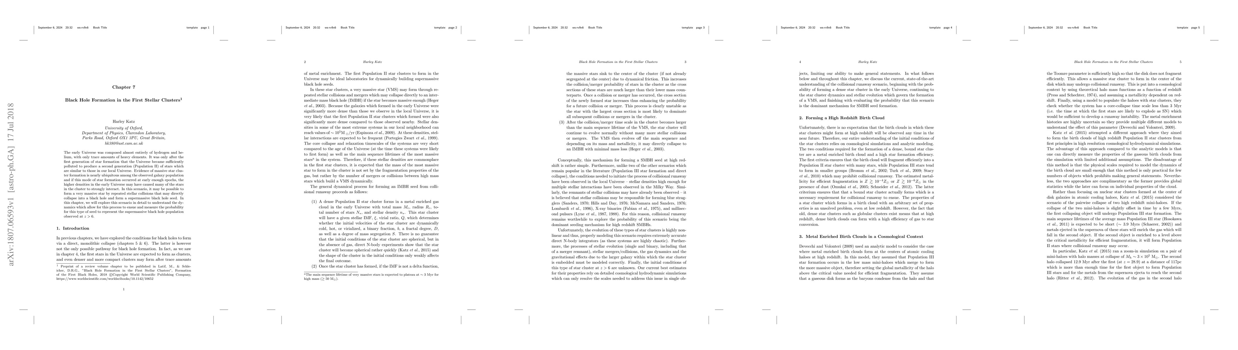The early Universe was composed almost entirely of hydrogen and helium, with only trace amounts of heavy elements. It was only after the first generation of star formation that the Universe became sufficiently polluted to produce a second generation (Population II) of stars which are similar to those in our local Universe. Evidence of massive star cluster formation is nearly ubiquitous among the observed galaxy population and if this mode of star formation occurred at early enough epochs, the higher densities in the early Universe may have caused many of the stars in the cluster to strongly interact. In this scenario, it may be possible to form a very massive star by repeated stellar collisions that may directly collapse into a black hole and form a supermassive black hole seed. In this chapter, we will explore this scenario in detail to understand the dynamics which allow for this process to ensue and measure the probability for this type of seed to represent the supermassive black hole population observed at z > 6.