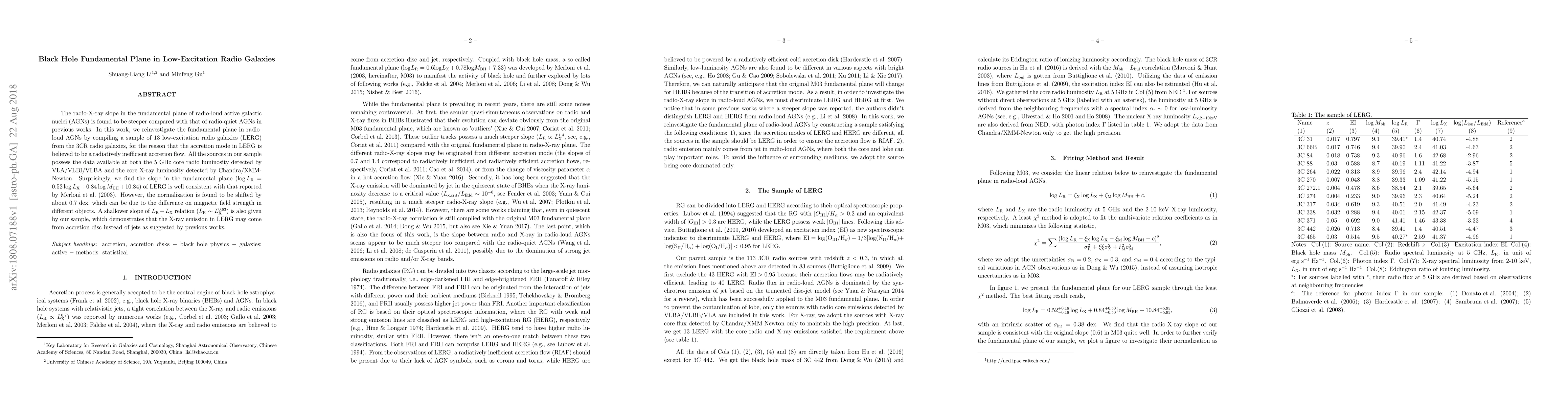 The radio-X-ray slope in the fundamental plane of radio-loud active galactic nuclei (AGNs) is found to be steeper compared with that of radio-quiet AGNs in previous works. In this work, we reinvestigate the fundamental plane in radio-loud AGNs by compiling a sample of 13 low-excitation radio galaxies (LERG) from the 3CR radio galaxies, for the reason that the accretion mode in LERG is believed to be a radiatively inefficient accretion flow. All the sources in our sample possess the data available at both the 5 GHz core radio luminosity detected by VLA/VLBI/VLBA and the core X-ray luminosity detected by Chandra/XMM-Newton. Surprisingly, we find the slope in the fundamental plane ($\log L_{\rm R}=0.52 \log L_{\rm X}+ 0.84 \log M_{\rm BH} + 10.84$) of LERG is well consistent with that reported by \citet{m2003}. However, the normalization is found to be shifted by about 0.7 dex, which can be due to the difference on magnetic field strength in different objects. A shallower slope of $L_{\rm R}-L_{\rm X}$ relation ($L_{\rm R}\sim L_{\rm X}^{0.63}$) is also given by our sample, which demonstrates that the X-ray emission in LERG may come from accretion disc instead of jets as suggested by previous works.