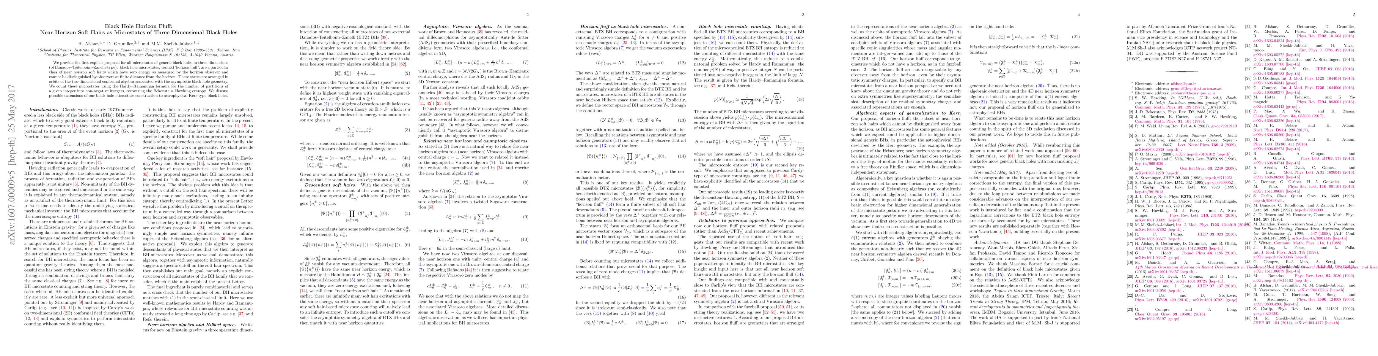 We provide the first explicit proposal for all microstates of generic black holes in three dimensions (of Banados-Teitelboim-Zanelli-type): black hole microstates, termed "horizon fluffs", are a particular class of near horizon soft hairs which have zero energy as measured by the horizon observer and cannot be distinguished by observers at finite distance from the horizon. These states are arranged in orbits of the two-dimensional conformal algebra associated with the asymptotic black hole geometry. We count these microstates using the Hardy-Ramanujan formula for the number of partitions of a given integer into non-negative integers, recovering the Bekenstein-Hawking entropy. We discuss possible extensions of our black hole microstate construction to astrophysical Kerr-type black holes.