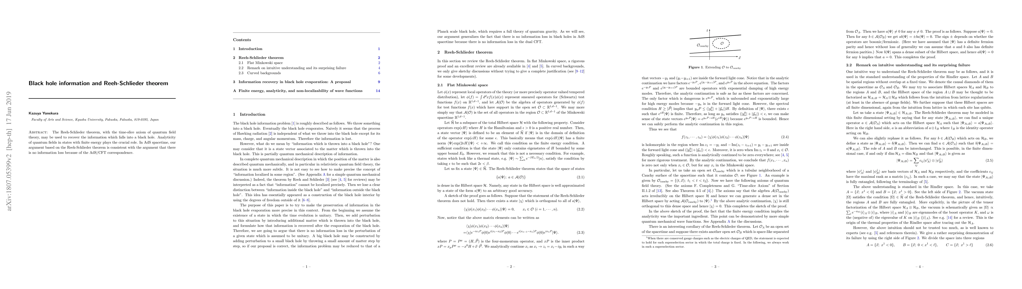 The Reeh-Schlieder theorem, with the time-slice axiom of quantum field theory, may be used to recover the information which falls into a black hole. Analyticity of quantum fields in states with finite energy plays the crucial role. In AdS spacetime, our argument based on the Reeh-Schlieder theorem is consistent with the argument that there is no information loss because of the AdS/CFT correspondence.