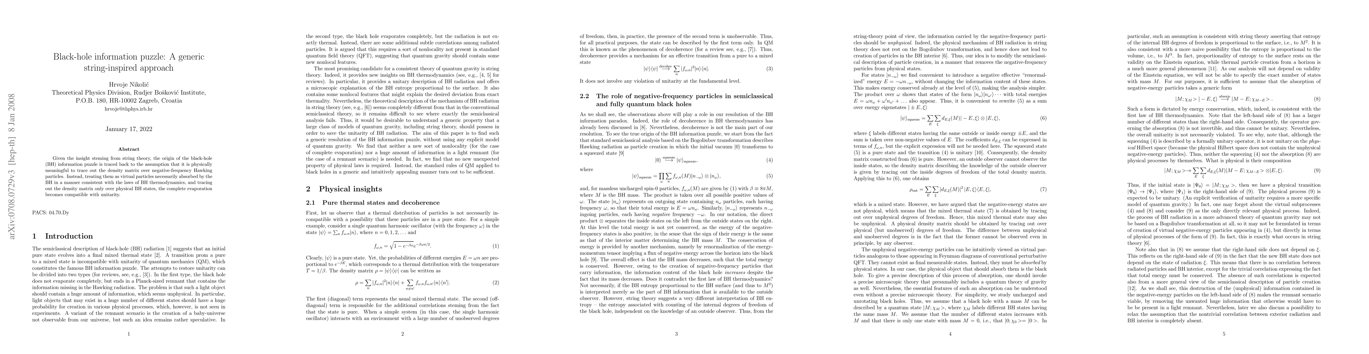 Given the insight steming from string theory, the origin of the black-hole (BH) information puzzle is traced back to the assumption that it is physically meaningful to trace out the density matrix over negative-frequency Hawking particles. Instead, treating them as virtual particles necessarily absorbed by the BH in a manner consistent with the laws of BH thermodynamics, and tracing out the density matrix only over physical BH states, the complete evaporation becomes compatible with unitarity.