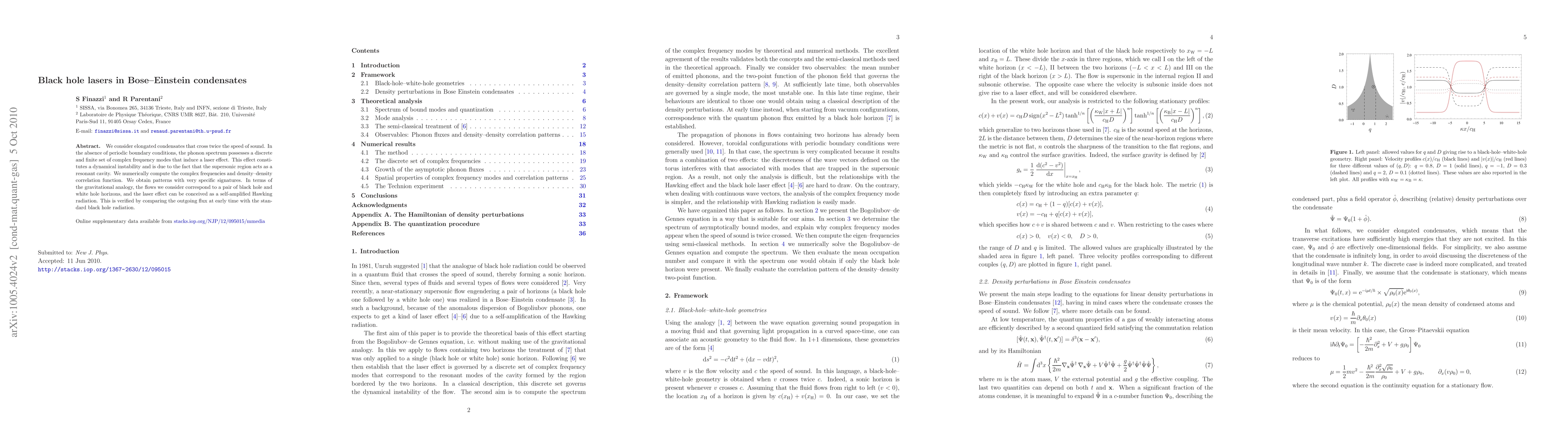 We consider elongated condensates that cross twice the speed of sound. In the absence of periodic boundary conditions, the phonon spectrum possesses a discrete and finite set of complex frequency modes that induce a laser effect. This effect constitutes a dynamical instability and is due to the fact that the supersonic region acts as a resonant cavity. We numerically compute the complex frequencies and density-density correlation function. We obtain patterns with very specific signatures. In terms of the gravitational analogy, the flows we consider correspond to a pair of black hole and white hole horizons, and the laser effect can be conceived as a self-amplified Hawking radiation. This is verified by comparing the outgoing flux at early time with the standard black hole radiation.