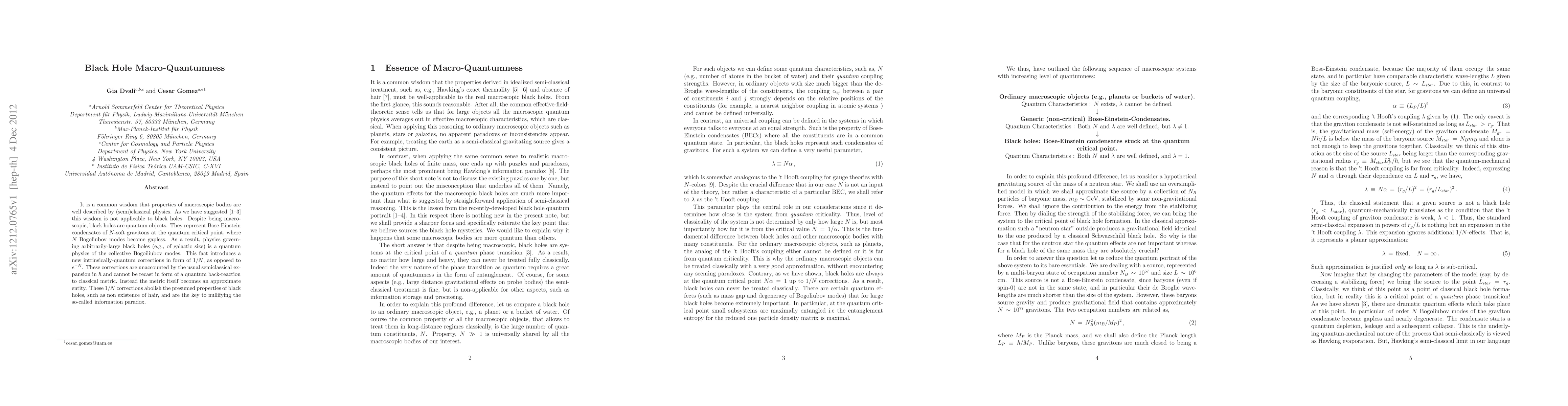 It is a common wisdom that properties of macroscopic bodies are well described by (semi)classical physics. As we have suggested this wisdom is not applicable to black holes. Despite being macroscopic, black holes are quantum objects. They represent Bose-Einstein condensates of N-soft gravitons at the quantum critical point, where N Bogoliubov modes become gapless. As a result, physics governing arbitrarily-large black holes (e.g., of galactic size) is a quantum physics of the collective Bogoiliubov modes. This fact introduces a new intrinsically-quantum corrections in form of 1/N, as opposed to exp(-N). These corrections are unaccounted by the usual semiclassical expansion in h and cannot be recast in form of a quantum back-reaction to classical metric. Instead the metric itself becomes an approximate entity. These 1/N corrections abolish the presumed properties of black holes, such as non existence of hair, and are the key to nullifying the so-called information paradox.