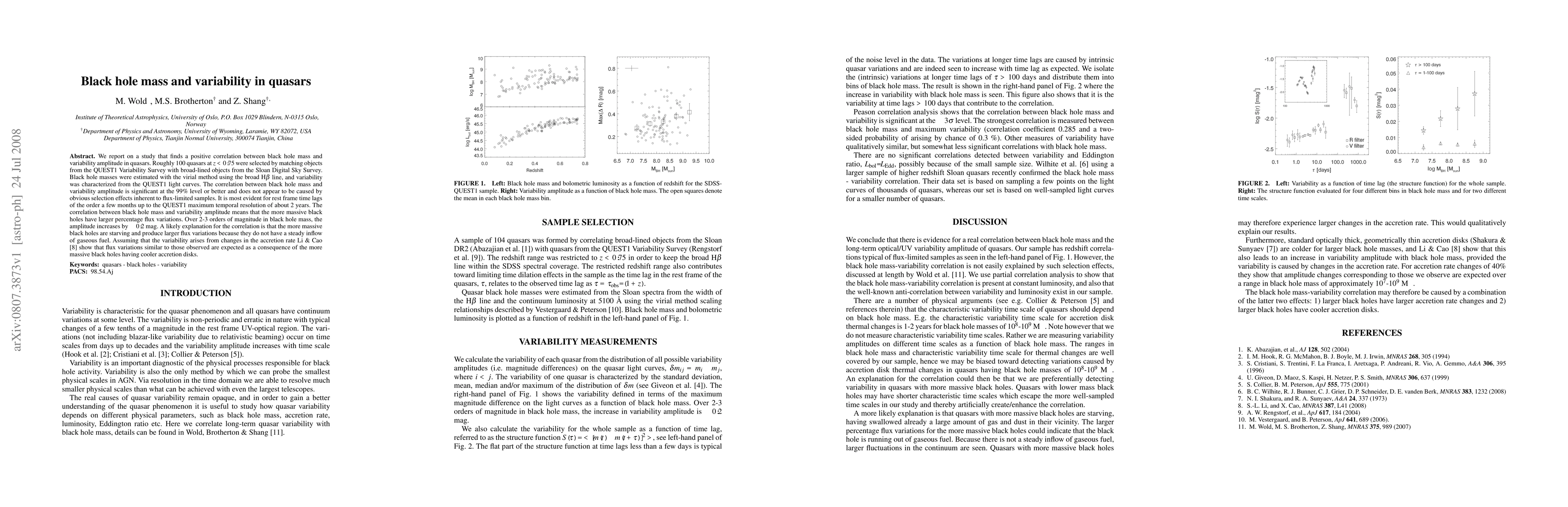 We report on a study that finds a positive correlation between black hole mass and variability amplitude in quasars. Roughly 100 quasars at z<0.75 were selected by matching objects from the QUEST1 Variability Survey with broad-lined objects from the Sloan Digital Sky Survey. Black hole masses were estimated with the virial method using the broad Hbeta line, and variability was characterized from the QUEST1 light curves. The correlation between black hole mass and variability amplitude is significant at the 99% level or better and does not appear to be caused by obvious selection effects inherent to flux-limited samples. It is most evident for rest frame time lags of the order a few months up to the QUEST1 maximum temporal resolution of about 2 years. The correlation between black hole mass and variability amplitude means that the more massive black holes have larger percentage flux variations. Over 2-3 orders of magnitude in black hole mass, the amplitude increases by approximately 0.2 mag. A likely explanation for the correlation is that the more massive black holes are starving and produce larger flux variations because they do not have a steady inflow of gaseous fuel. Assuming that the variability arises from changes in the accretion rate Li & Cao [8] show that flux variations similar to those observed are expected as a consequence of the more massive black holes having cooler accretion disks.