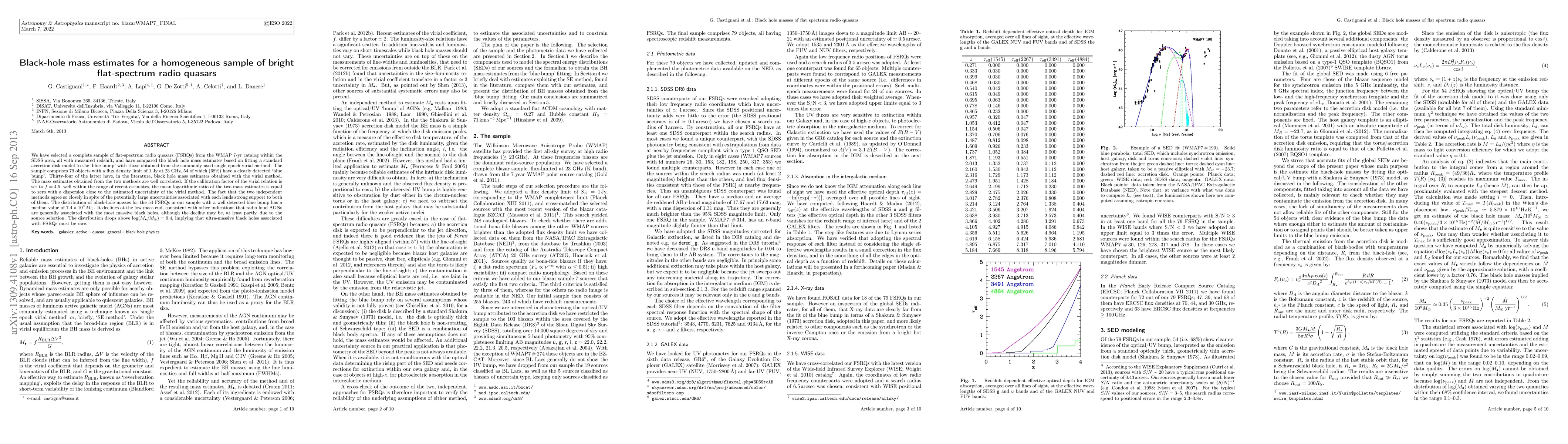 We have selected a complete sample of flat-spectrum radio quasars (FSRQs) from the WMAP 7-yr catalog within the SDSS area, all with measured redshift, and have compared the black hole mass estimates based on fitting a standard accretion disk model to the `blue bump' with those obtained from the commonly used single epoch virial method. The sample comprises 79 objects with a flux density limit of 1 Jy at 23 GHz, 54 of which (68%) have a clearly detected `blue bump'. Thirty-four of the latter have, in the literature, black hole mass estimates obtained with the virial method. The mass estimates obtained from the two methods are well correlated. If the calibration factor of the virial relation is set to $f=4.5$, well within the range of recent estimates, the mean logarithmic ratio of the two mass estimates is equal to zero with a dispersion close to the estimated uncertainty of the virial method. The fact that the two independent methods agree so closely in spite of the potentially large uncertainties associated with each lends strong support to both of them. The distribution of black-hole masses for the 54 FSRQs in our sample with a well detected blue bump has a median value of $7.4\times 10^{8}\,M_\odot$. It declines at the low mass end, consistent with other indications that radio loud AGNs are generally associated with the most massive black holes, although the decline may be, at least partly, due to the source selection. The distribution drops above $\log(M_\bullet/M_\odot) = 9.4$, implying that ultra-massive black holes associated with FSRQs must be rare.