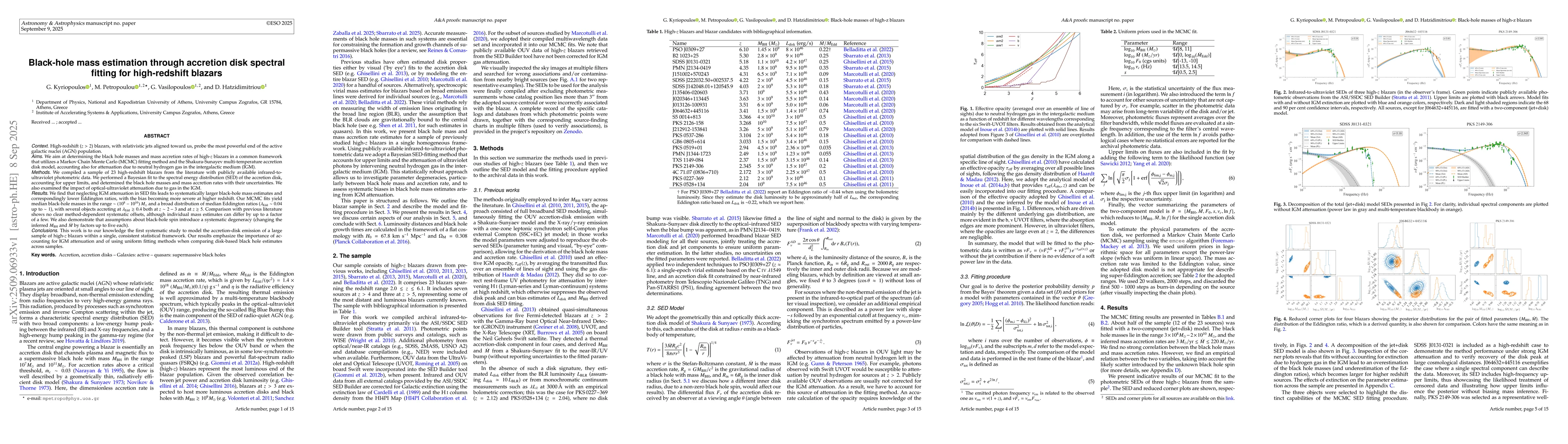 High-redshift ($z>2$) blazars, with relativistic jets aligned toward us, probe the most powerful end of the active galactic nuclei (AGN) population. We aim at determining the black hole masses and mass accretion rates of high-$z$ blazars in a common framework that utilizes a Markov Chain Monte Carlo (MCMC) fitting method and the Shakura-Sunayev multi-temperature accretion disk model, accounting also for attenuation due to neutral hydrogen gas in the intergalactic medium (IGM). We compiled a sample of 23 high-redshift blazars from the literature with publicly available infrared-to-ultraviolet photometric data. We performed a Bayesian fit to the spectral energy distribution (SED) of the accretion disk, accounting for upper limits, and determined the black hole masses and mass accretion rates with their uncertainties. We also examined the impact of optical-ultraviolet attenuation due to gas in the IGM. We find that neglecting IGM attenuation in SED fits leads to systematically larger black-hole mass estimates and correspondingly lower Eddington ratios, with the bias becoming more severe at higher redshift. Our MCMC fits yield median black-hole masses in the range $\sim (10^{8}-10^{10})\,M_{\odot}$ and a broad distribution of median Eddington ratios ($\lambda_{\rm Edd}\sim 0.04 - 1$). Comparison with previous literature shows no clear method-dependent systematic offsets, although individual mass estimates can differ by up to a factor of a few. We also demonstrate that assumptions about black-hole spin introduce a systematic degeneracy. This work is to our knowledge the first systematic study to model the accretion-disk emission of a large sample of high-$z$ blazars within a single, consistent statistical framework. Our results emphasize the importance of accounting for IGM attenuation and of using uniform fitting methods when comparing disk-based black hole estimates across samples.
