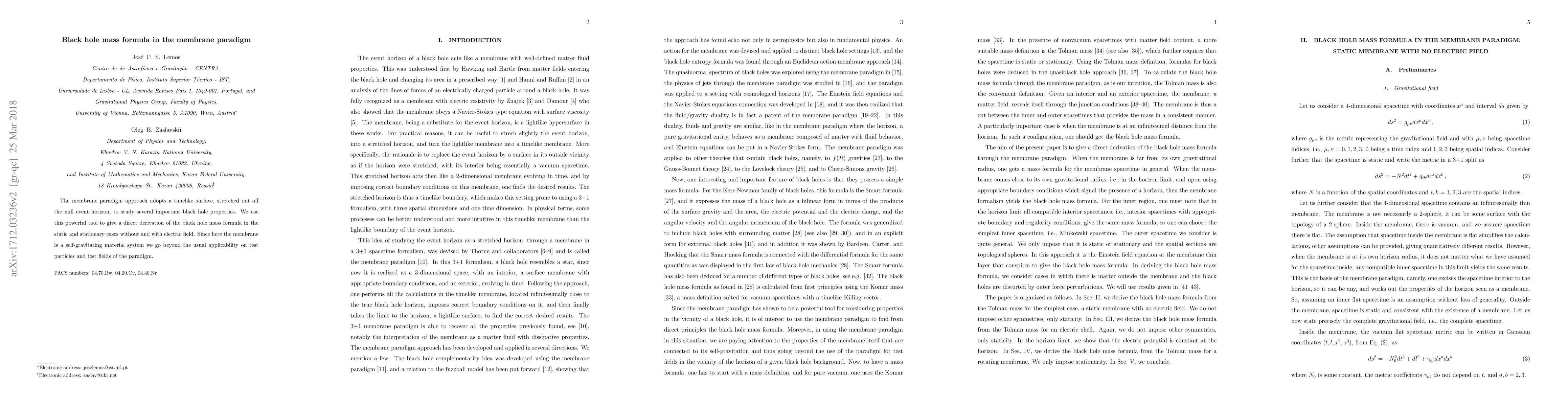 The membrane paradigm approach adopts a timelike surface, stretched out off the null event horizon, to study several important black hole properties. We use this powerful tool to give a direct derivation of the black hole mass formula in the static and stationary cases without and with electric field. Since here the membrane is a self-gravitating material system we go beyond the usual applicability on test particles and test fields of the paradigm.