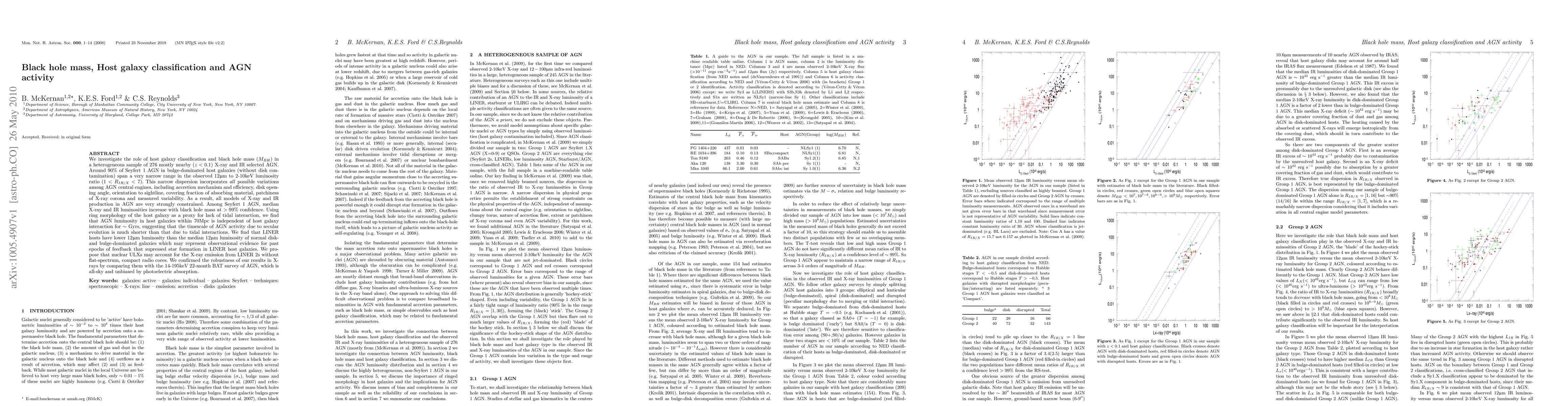 This study examines the relationship between black hole mass, host galaxy classification, and AGN activity in a sample of 276 nearby AGN. It finds that Seyfert 1 AGN in bulge-dominated galaxies exhibit a narrow range in luminosity ratios, constraining models of AGN X-ray and IR production. Additionally, AGN luminosity correlates with black hole mass, and AGN activity timescales due to secular evolution are shorter than those from tidal interactions.
