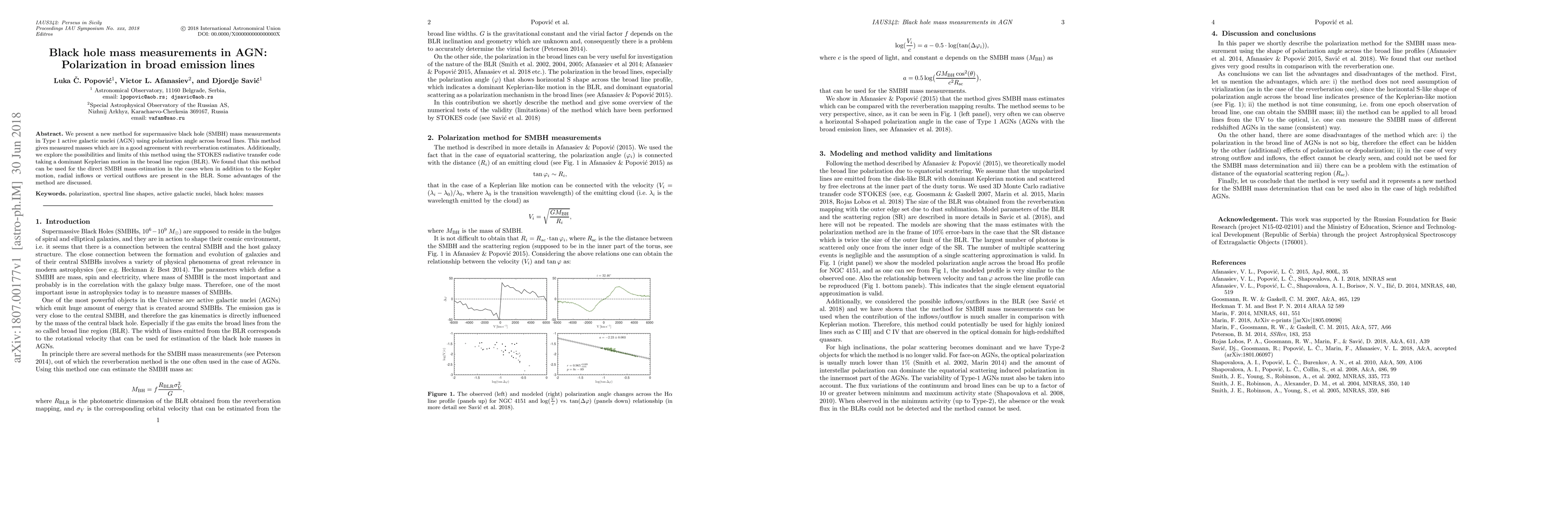 We present a new method for supermassive black hole (SMBH) mass measurements in Type 1 active galactic nuclei (AGN) using polarization angle across broad lines. This method gives measured masses which are in a good agreement with reverberation estimates. Additionally, we explore the possibilities and limits of this method using the STOKES radiative transfer code taking a dominant Keplerian motion in the broad line region (BLR). We found that this method can be used for the direct SMBH mass estimation in the cases when in addition to the Kepler motion, radial inflows or vertical outflows are present in the BLR. Some advantages of the method are discussed.