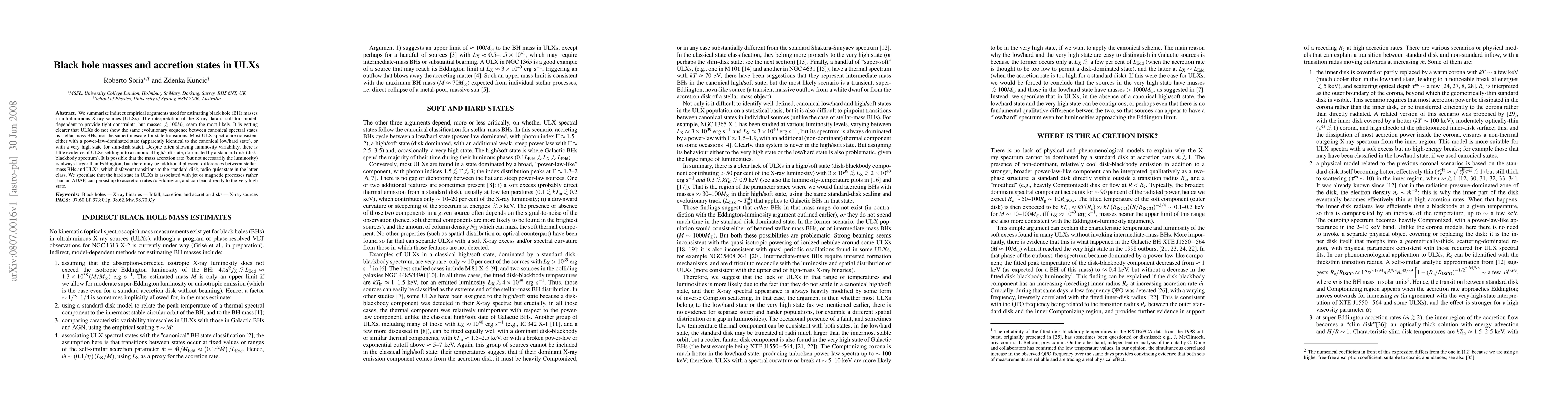 We summarize indirect empirical arguments used for estimating black hole (BH) masses in ultraluminous X-ray sources (ULXs). The interpretation of the X-ray data is still too model-dependent to provide tight constraints, but masses <~ 100 Msun seem the most likely. It is getting clearer that ULXs do not show the same evolutionary sequence between canonical spectral states as stellar-mass BHs, nor the same timescale for state transitions. Most ULX spectra are consistent either with a power-law-dominated state (apparently identical to the canonical low/hard state), or with a very high state (or slim-disk state). Despite often showing luminosity variability, there is little evidence of ULXs settling into a canonical high/soft state, dominated by a standard disk (disk-blackbody spectrum). It is possible that the mass accretion rate (but not necessarily the luminosity) is always higher than Eddington; but there may be additional physical differences between stellar-mass BHs and ULXs, which disfavour transitions to the standard-disk, radio-quiet state in the latter class. We speculate that the hard state in ULXs is associated with jet or magnetic processes rather than an ADAF, can persist up to accretion rates ~ Eddington, and can lead directly to the very high state.