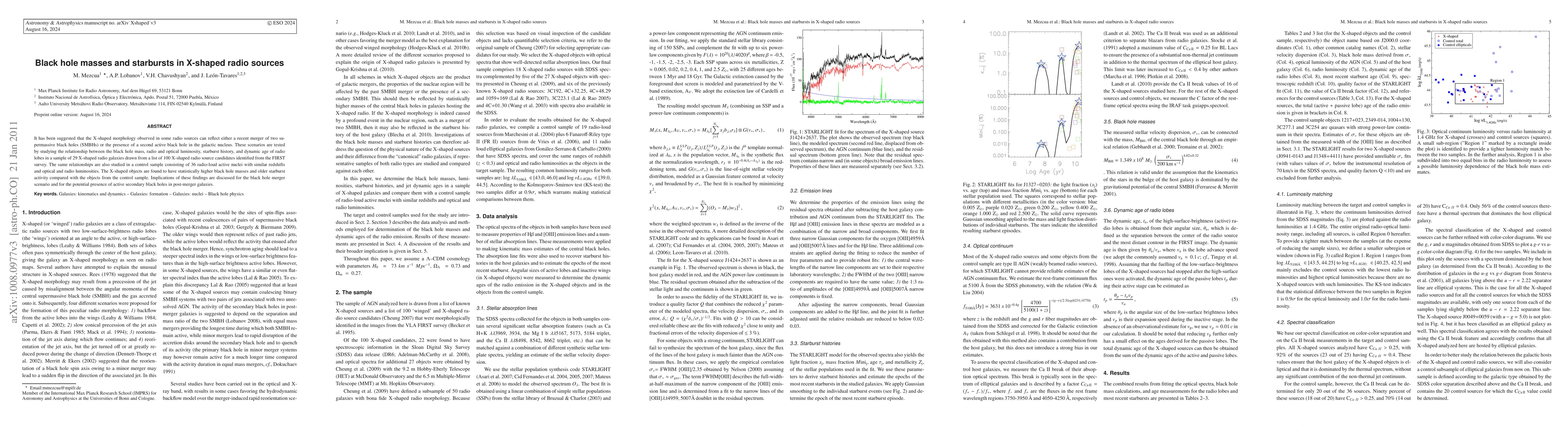 This study investigates the black hole masses and starburst histories in X-shaped radio sources, finding higher black hole masses and older starburst activity in these objects compared to a control sample. The results support the hypothesis that X-shaped morphologies may indicate recent supermassive black hole mergers or the presence of active secondary black holes.