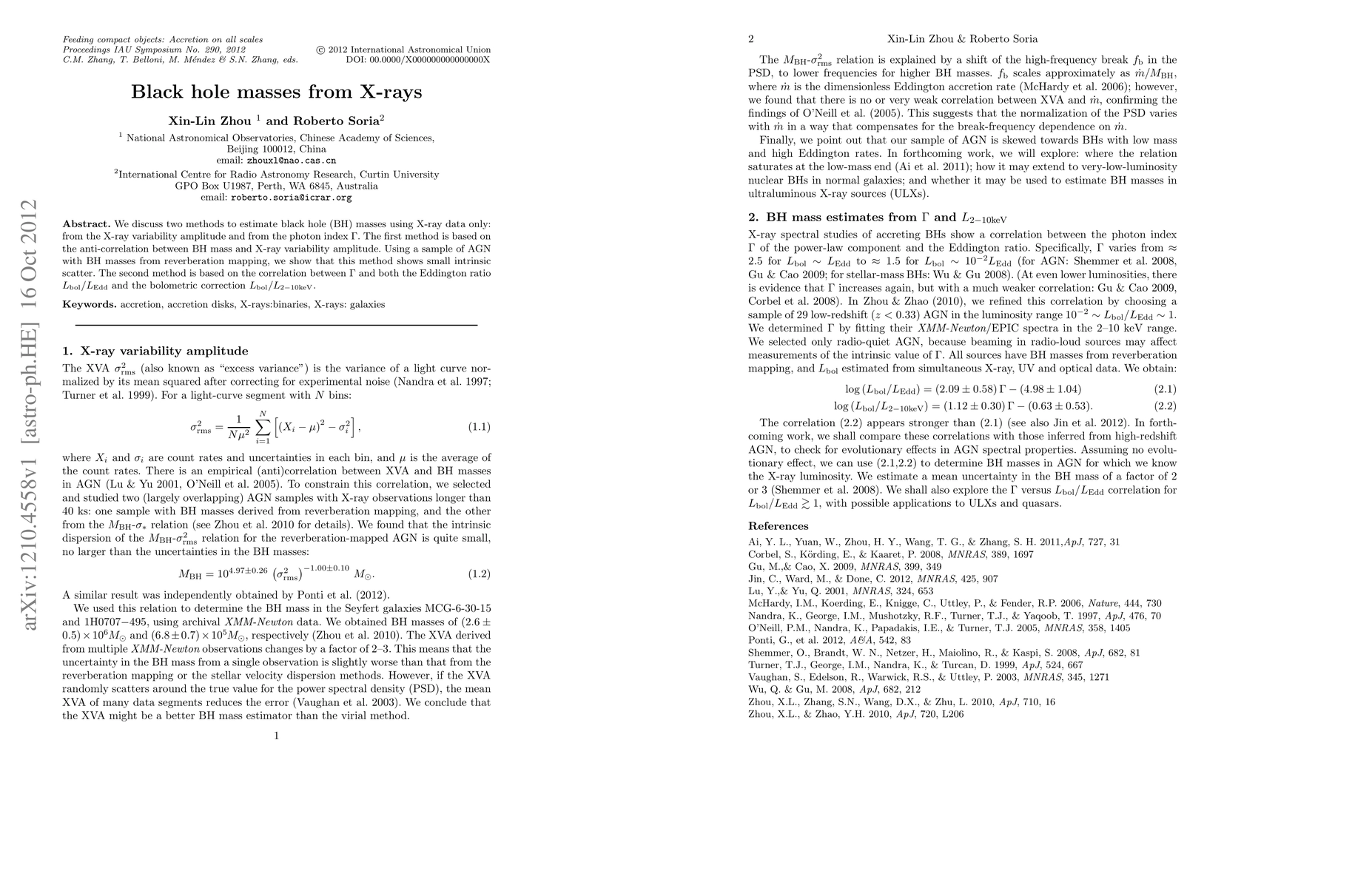 This paper presents two methods for estimating black hole masses using X-ray data: one based on the anti-correlation between black hole mass and X-ray variability amplitude, and another correlating the photon index Gamma with the Eddington ratio and bolometric correction. Both methods show promising accuracy with minimal intrinsic scatter.