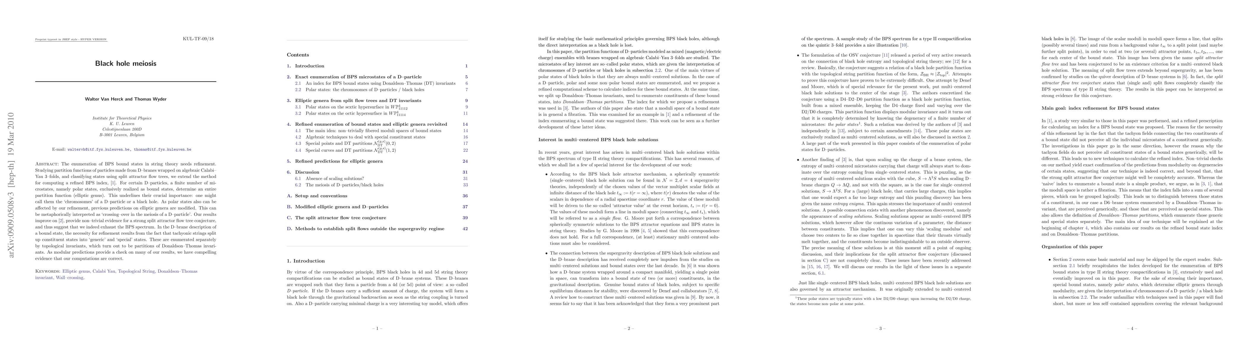 The enumeration of BPS bound states in string theory needs refinement. Studying partition functions of particles made from D-branes wrapped on algebraic Calabi-Yau 3-folds, and classifying states using split attractor flow trees, we extend the method for computing a refined BPS index, arXiv:0810.4301. For certain D-particles, a finite number of microstates, namely polar states, exclusively realized as bound states, determine an entire partition function (elliptic genus). This underlines their crucial importance: one might call them the `chromosomes' of a D-particle or a black hole. As polar states also can be affected by our refinement, previous predictions on elliptic genera are modified. This can be metaphorically interpreted as `crossing-over in the meiosis of a D-particle'. Our results improve on hep-th/0702012, provide non-trivial evidence for a strong split attractor flow tree conjecture, and thus suggest that we indeed exhaust the BPS spectrum. In the D-brane description of a bound state, the necessity for refinement results from the fact that tachyonic strings split up constituent states into `generic' and `special' states. These are enumerated separately by topological invariants, which turn out to be partitions of Donaldson-Thomas invariants. As modular predictions provide a check on many of our results, we have compelling evidence that our computations are correct.